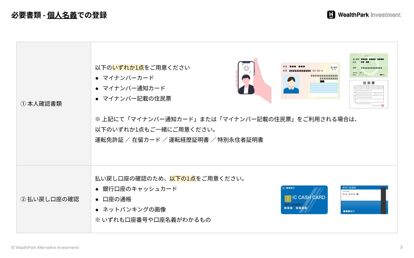 2. © WealthPark Alternative Investments 必要書類 - 個⼈名義での登録 3 ① 本⼈確認書類
