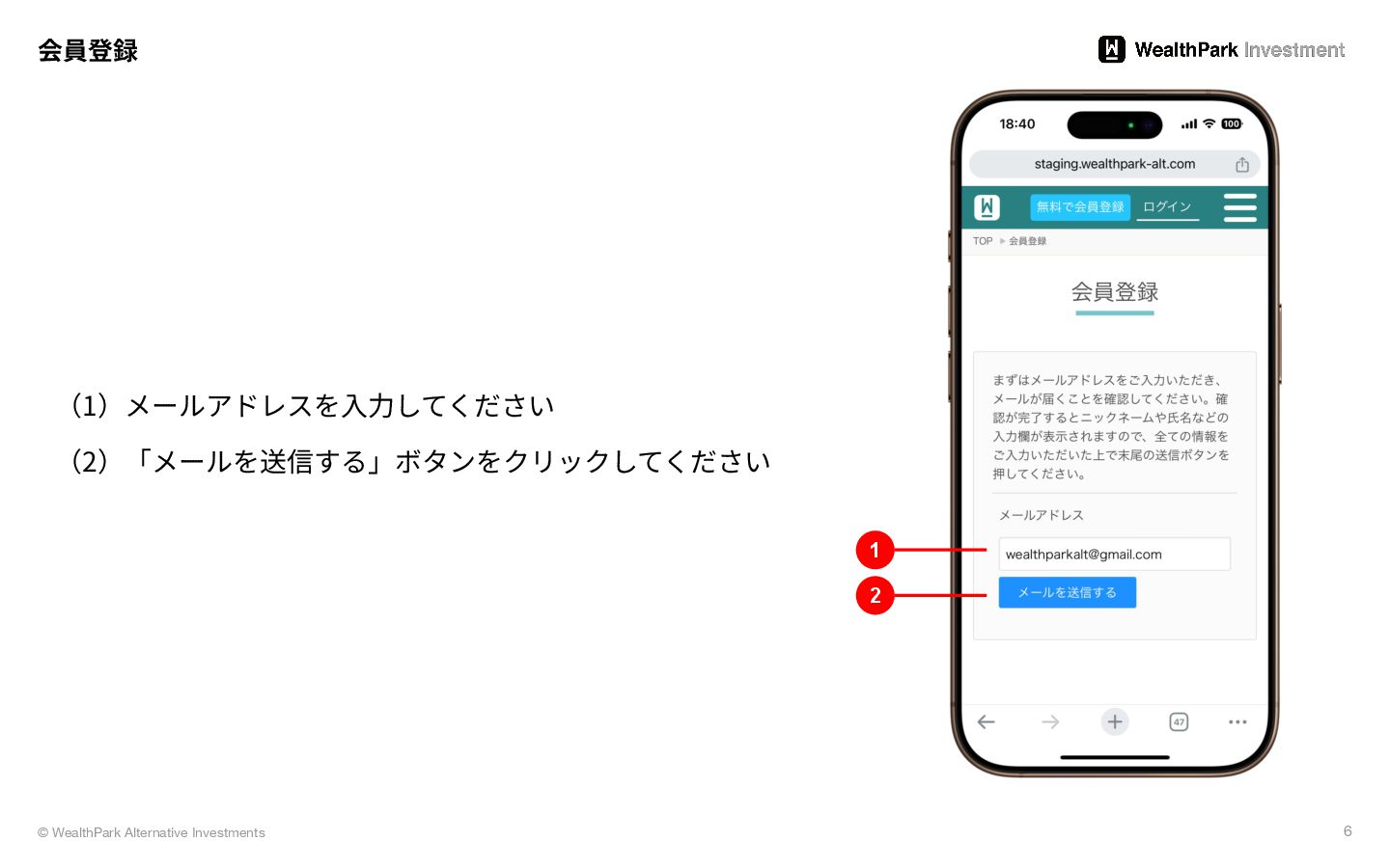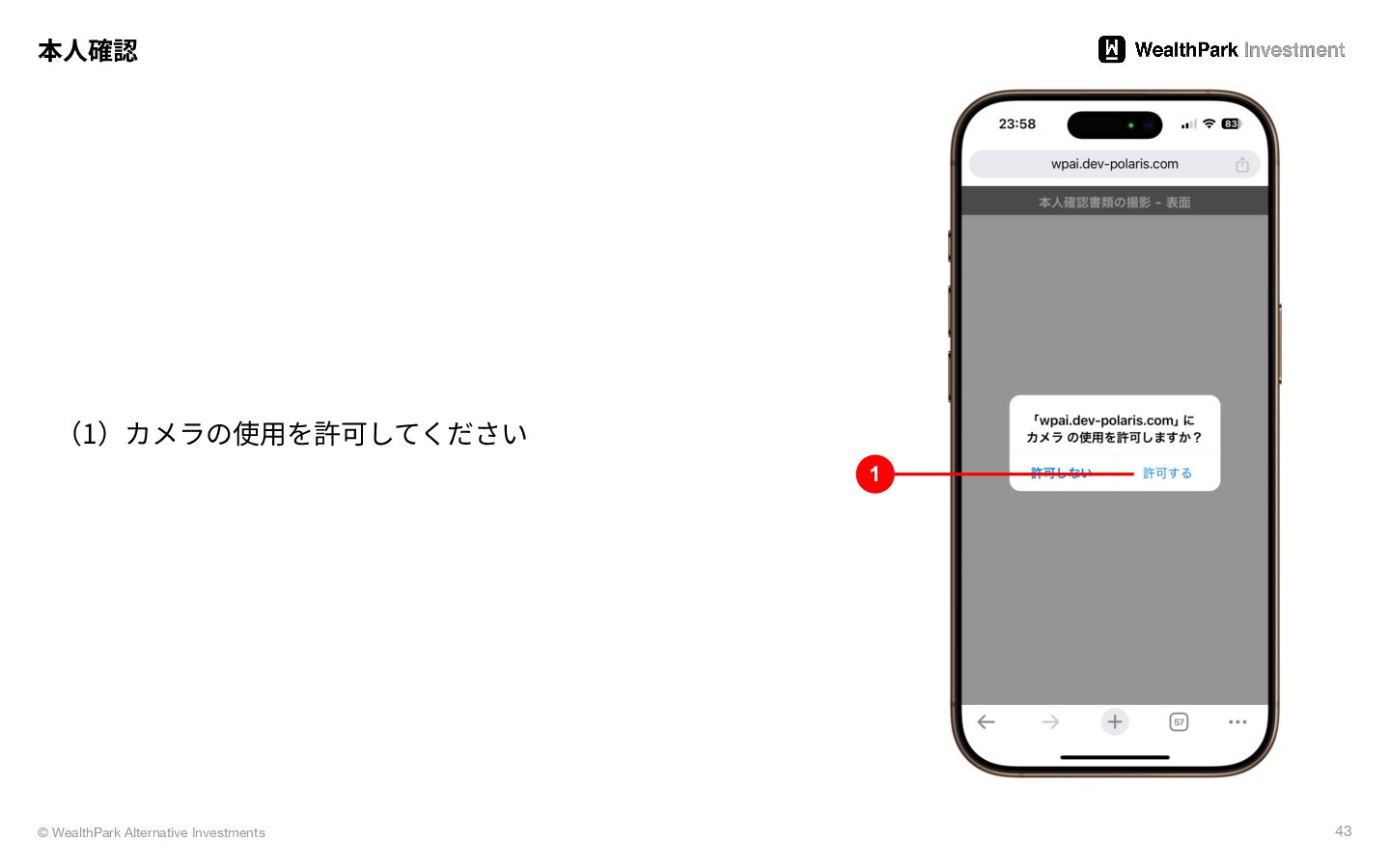6. © WealthPark Alternative Investments 本⼈確認 登録された⽅がご本⼈ (法⼈の場合‧ご担当者様ご本⼈) であるこ とを確認します (1)スマートフォンを利⽤する(オススメ)