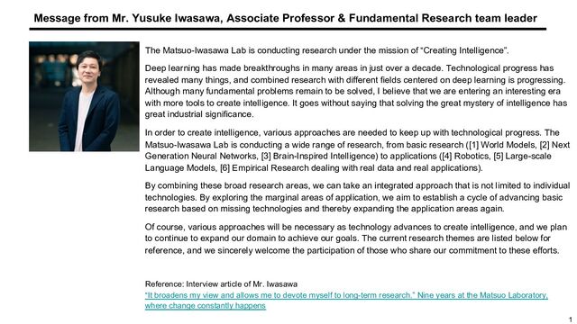 Models (LLM) to study the next generation of LLM Understand the performance / success sources of LLM and use that knowledge to control model behavior. • State Space Model • Lightweight • Multimodal, VLM • Multi-token Prediction • Model fusion • LLM agents (using tools) • LLM self-evolution The challenge is to break out of the current paradigm of LLM based on the Transformer structure, and to research the next generation of LLM that are more efficient and perform better. • Domain-specific Fine-tuning • Continual pre-training • PEFT (LoRA, Prompt-tuning) • Integration with knowledge base • Compliance with rules • Medical LLM Conduct domain-specific research that is important for social implementation of LLM. Research on specialization in specific domains such as medicine, finance, etc., and research on specialization methods themselves will also be conducted. [5] Large Language Model Key words Key words Key words Theme 2 Beyond Transformer Theme 3 Domain specialization Theme 1 Understanding and control of operating principles • Analysis of internal behavior (Logit Lenses, Circuits, Induction Head, Task Vector) • In-context learning • AI Safety (Hallucination, Bias, Watermark, Prompt Attack, Unlearning, Copyright) • Science of training data, pseudo-data generation • Integration with computational linguistics