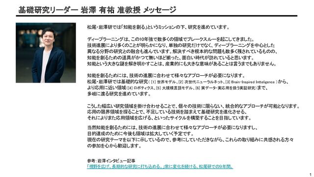 Circuits, Induction Head, Task Vector) • 文脈内学習 • AI Safety (Hallucination, Bias, Watermark, Prompt Attack, Unlearning, Copyright) • 学習データの科学、疑似データの生成 • 計算言語学との融合 • 状態空間モデル • 軽量化 • マルチモーダル, VLM • Multi-token Prediction • モデル融合 • LLMエージェント (ツール利用) • LLMの自己進化 現状のTransformer構造をベースとした大規模言 語モデルのパラダイムを打破し、より効率的で高 い性能を発揮する次世代の大規模 言語モデルの研究に挑む。 • Domain-specific Fine-tuning • 継続事前学習 • PEFT (LoRA, Prompt-tuning) • 知識ベースとの融合 • ルールの遵守 • 医療LLM 大規模言語モデルの社会実装を行う上で 重要な領域特化の研究を行う。 医療、金融等の専門領域に特化する研究、 そして特化手法自体に対する研究も行う。 [5] 大規模言語モデル キーワード例 キーワード例 キーワード例 テーマ① 動作原理の 理解と制御 テーマ③ ドメイン 特化 テーマ② Beyond Transformer