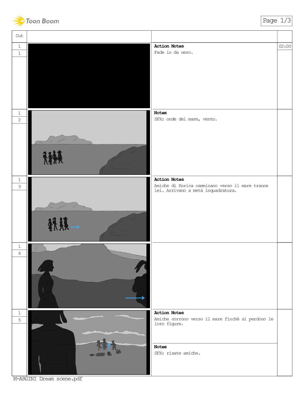 1 2 Notes SFX: onde del mare, vento. 1 3 Action Notes Amiche di Enrica camminano verso il mare tranne lei. Arrivano a metà inquadratura. 1 4 1 5 Action Notes Amiche corrono verso il mare finché si perdono le loro figure. Notes SFX: risate amiche. Page 1/3 M-ARGINI Dream scene.pdf