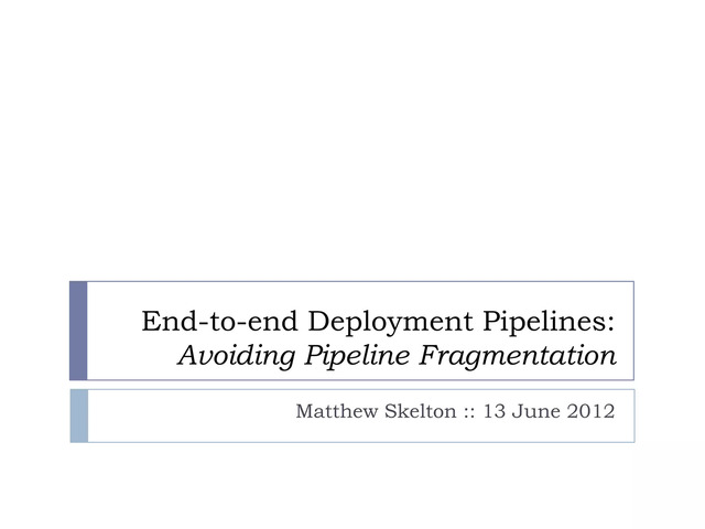 The deployment pipeline is a key feature of continuous delivery. Avoiding fragmentation of deployment pipelines is crucial if the maximum benefit is to be derived from pipelines. This presentation shows why pipeline fragmentation is bad, examines some of the reasons why pipeline fragmentation may occur, and explores some of the challenges involved in implementing end-to-end deployment pipelines.