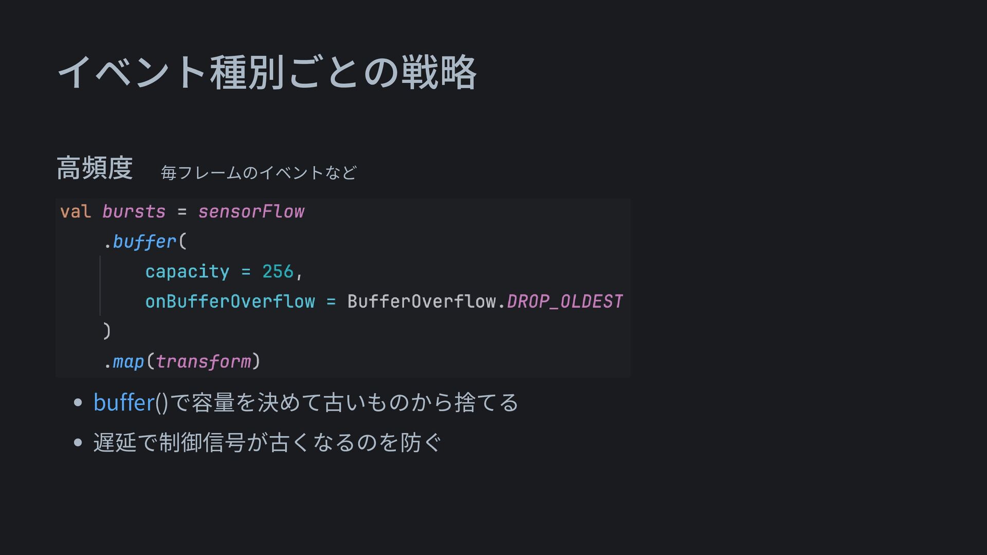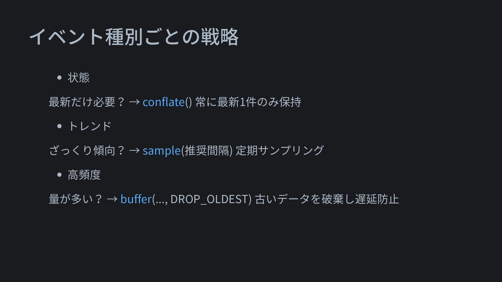 イベント種別ごとの戦略 • 状態 最新だけ必要? → conflate() 常に最新1件のみ保持 • トレンド ざっくり傾向?