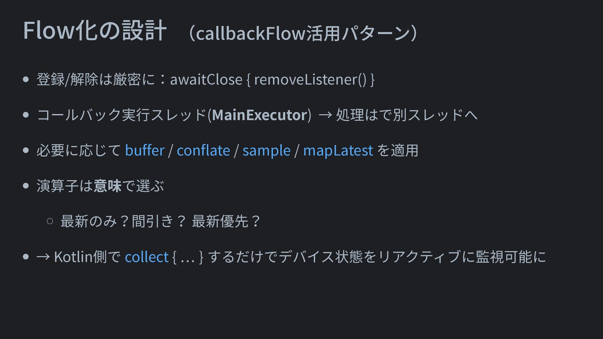 必要に応じて buffer / conflate / sample / mapLatest を適用 • 演算子は意味で選ぶ ⚬ 最新のみ?間引き? 最新優先? • → Kotlin側で collect { … } するだけでデバイス状態をリアクティブに監視可能に Flow化の設計 (callbackFlow活用パターン)