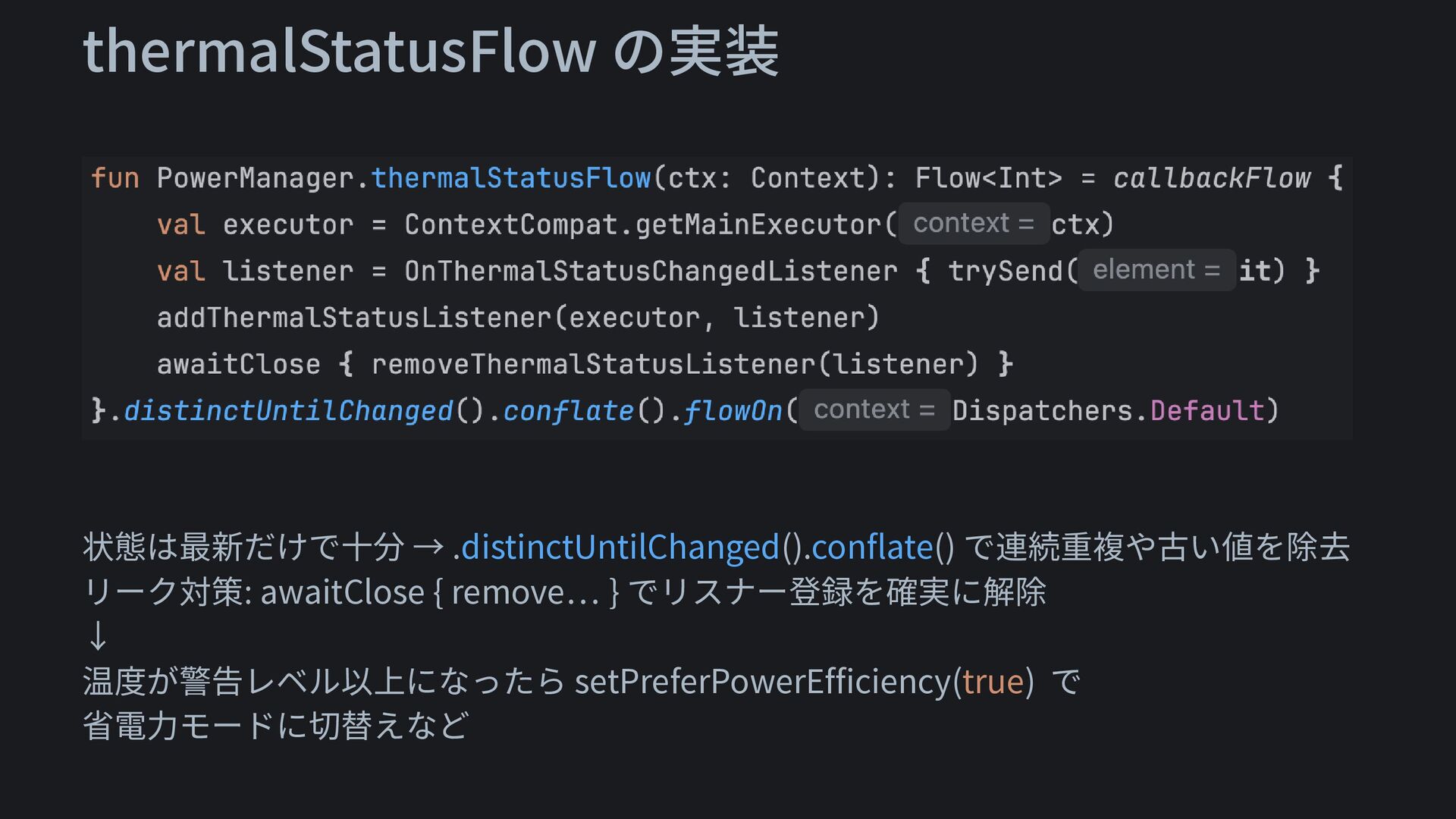 thermalStatusFlow の実装 状態は最新だけで十分 → .distinctUntilChanged().conflate() で連続重複や古い値を除去 リーク対策: awaitClose { remove…