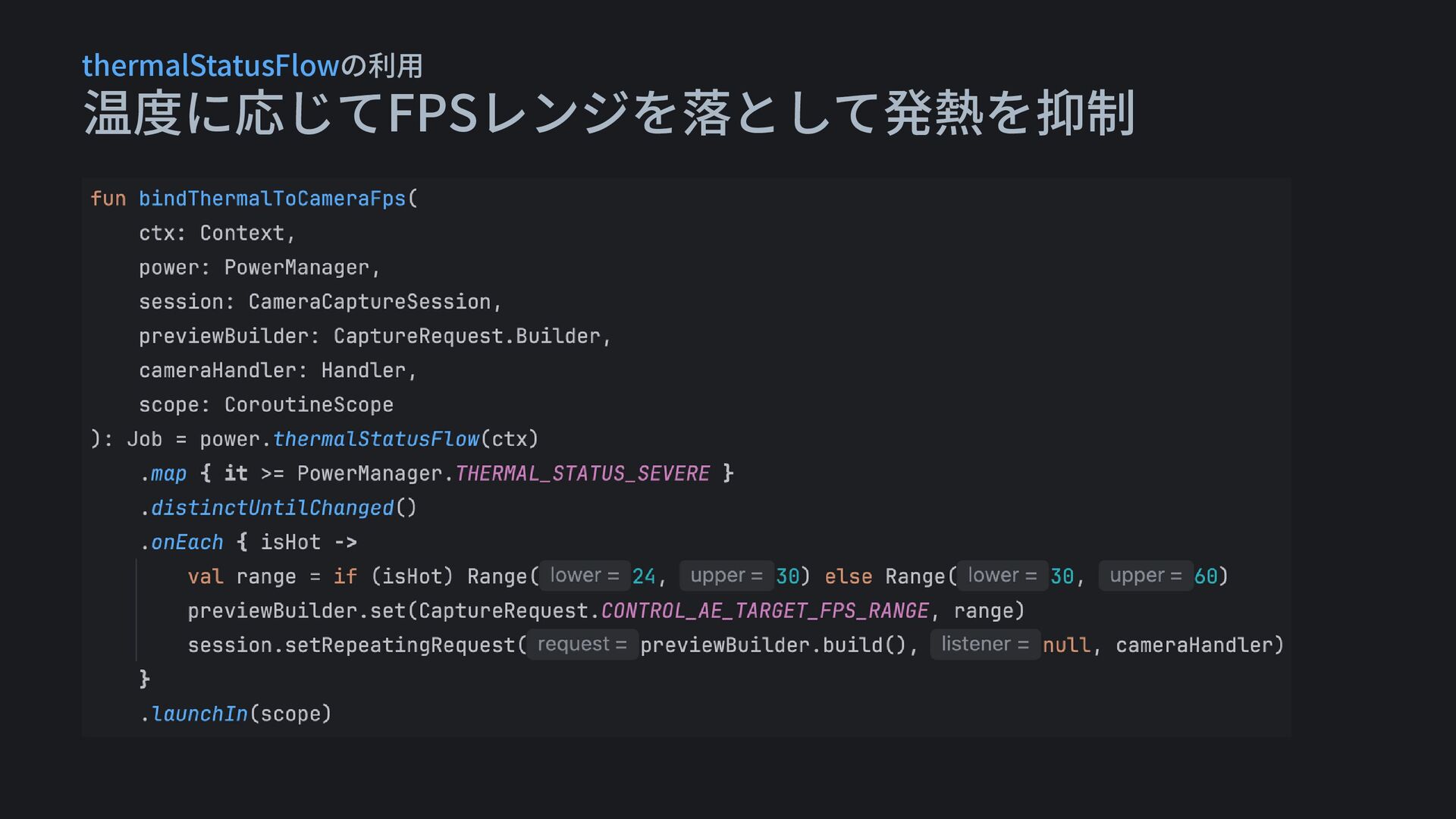 温度に応じてFPSレンジを落として発熱を抑制 thermalStatusFlowの利用