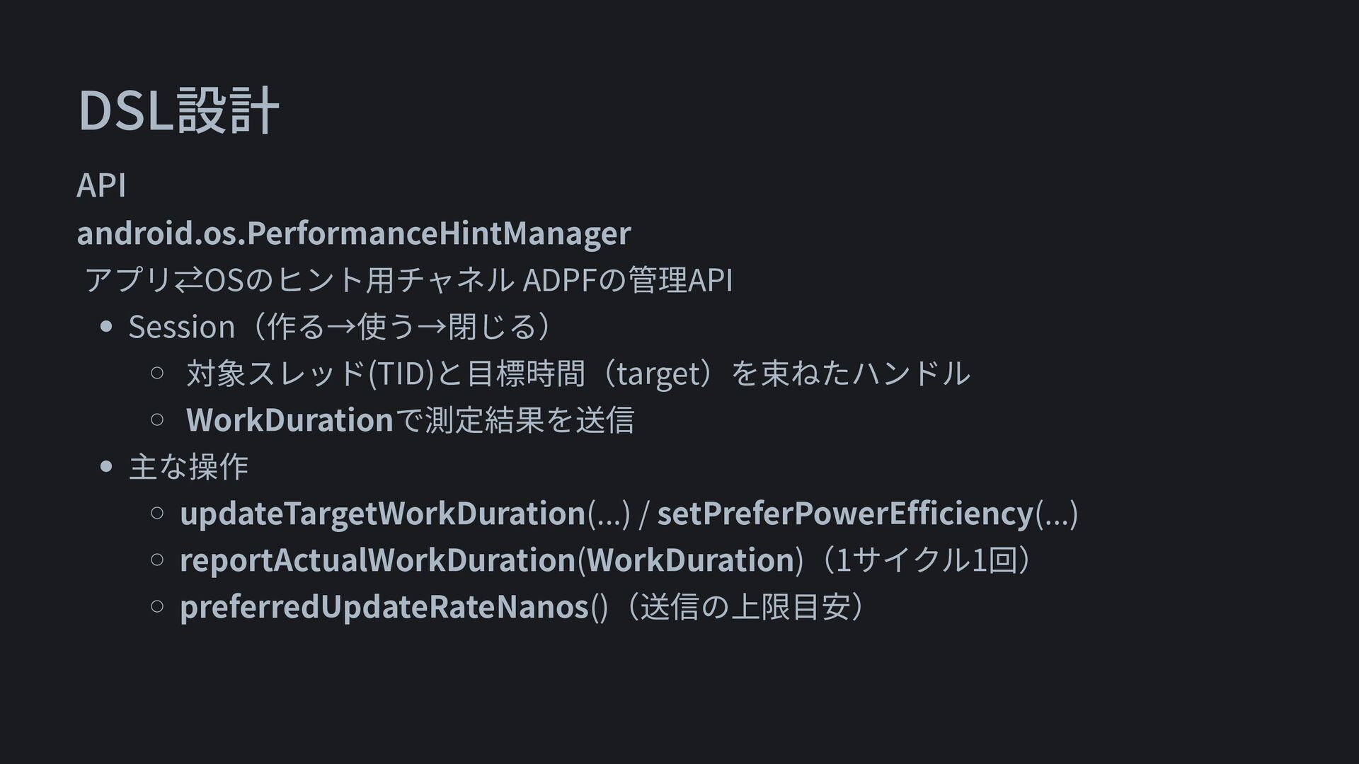DSL設計 API android.os.PerformanceHintManager アプリ⇄OSのヒント用チャネル ADPFの管理API • Session(作る→使う→閉じる) ⚬ 対象スレッド(TID)と目標時間(target)を束ねたハンドル ⚬