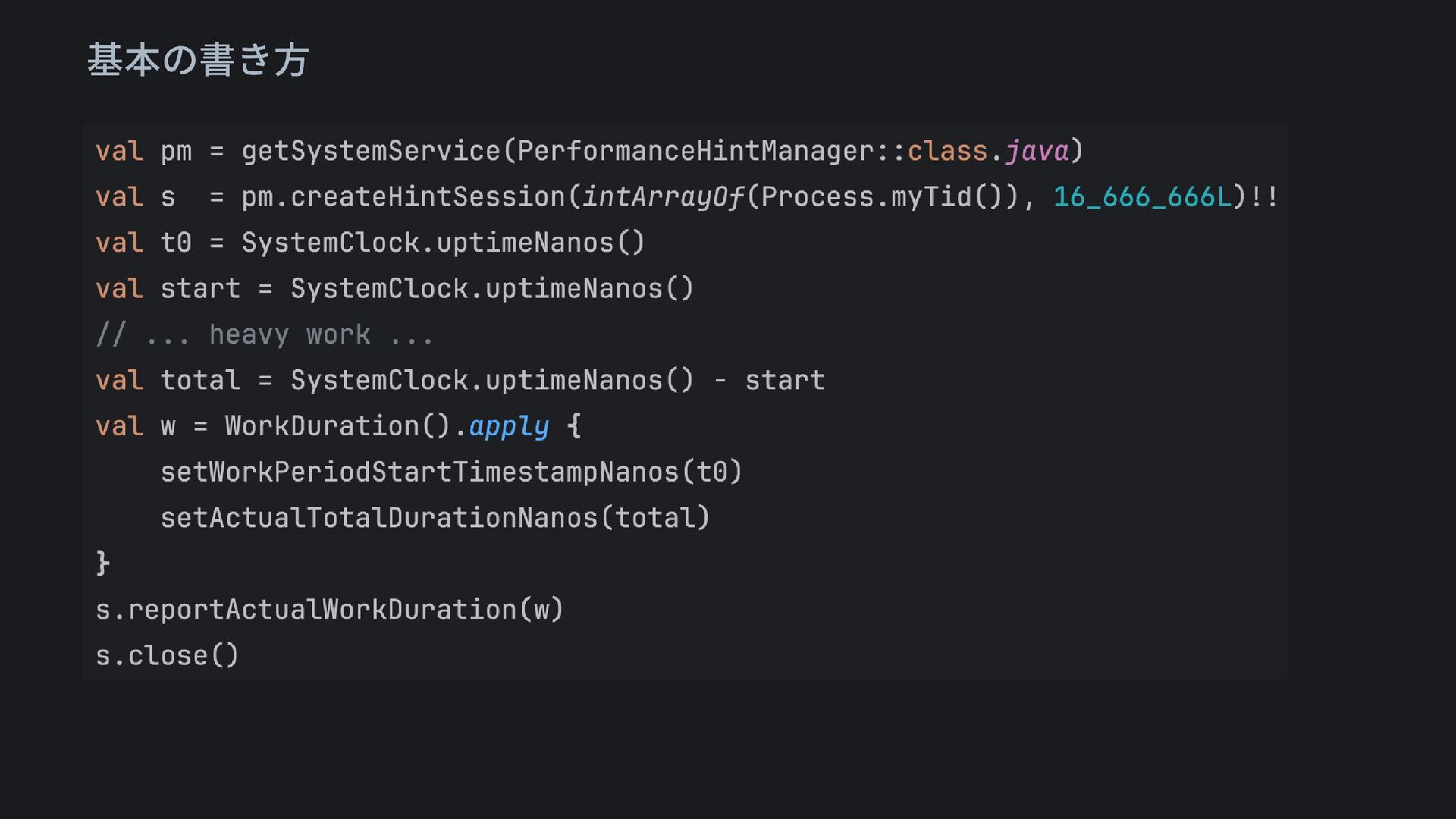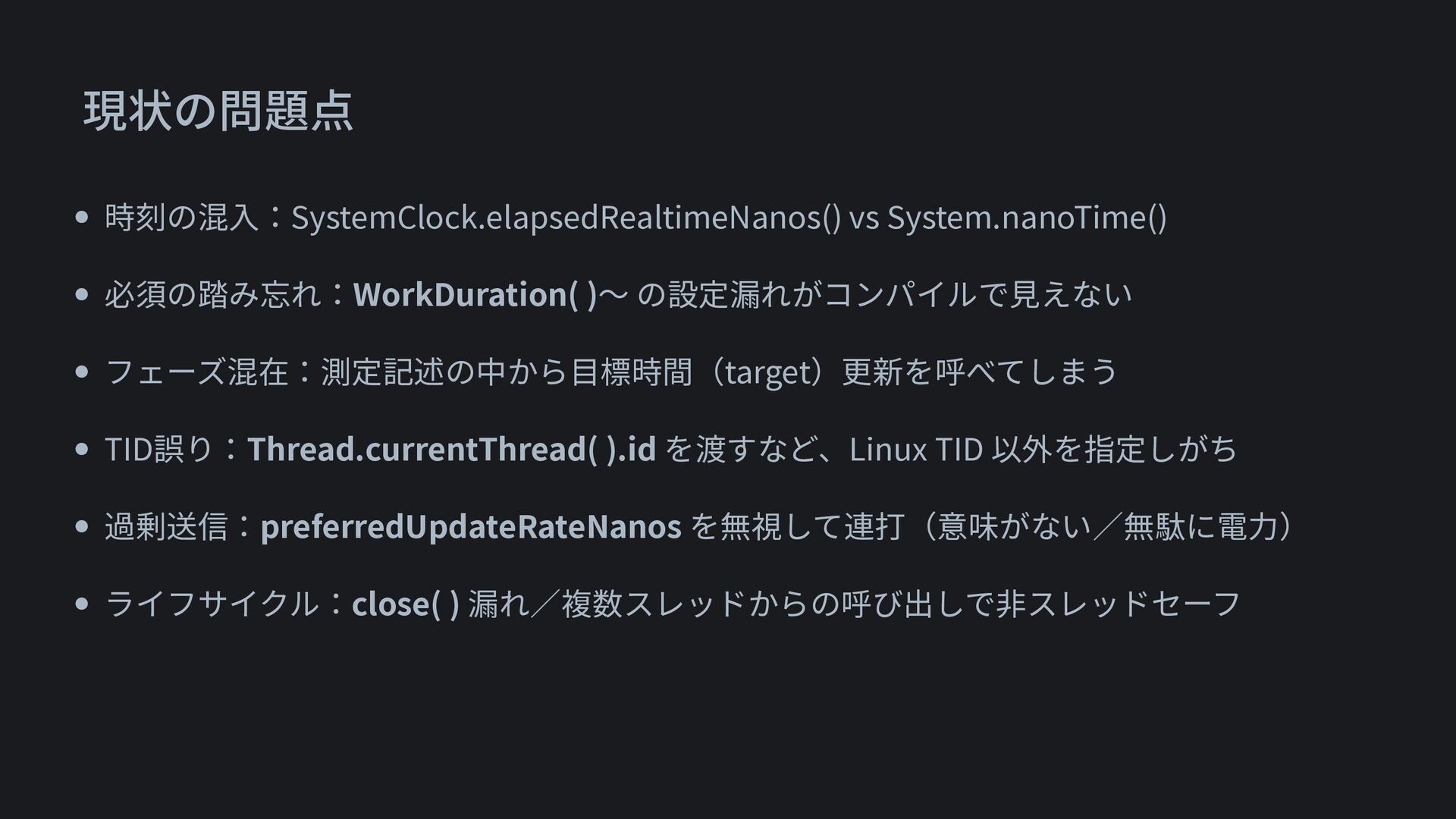 • 時刻の混入:SystemClock.elapsedRealtimeNanos() vs System.nanoTime() • 必須の踏み忘れ:WorkDuration( )〜 の設定漏れがコンパイルで見えない • フェーズ混在:測定記述の中から目標時間(target)更新を呼べてしまう