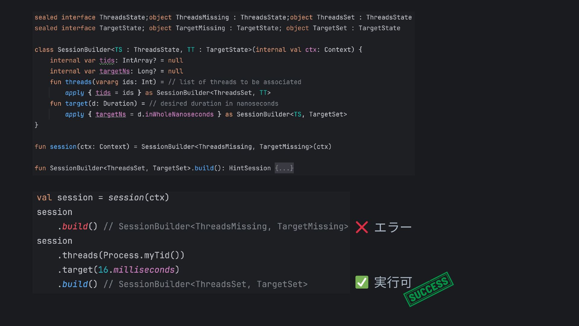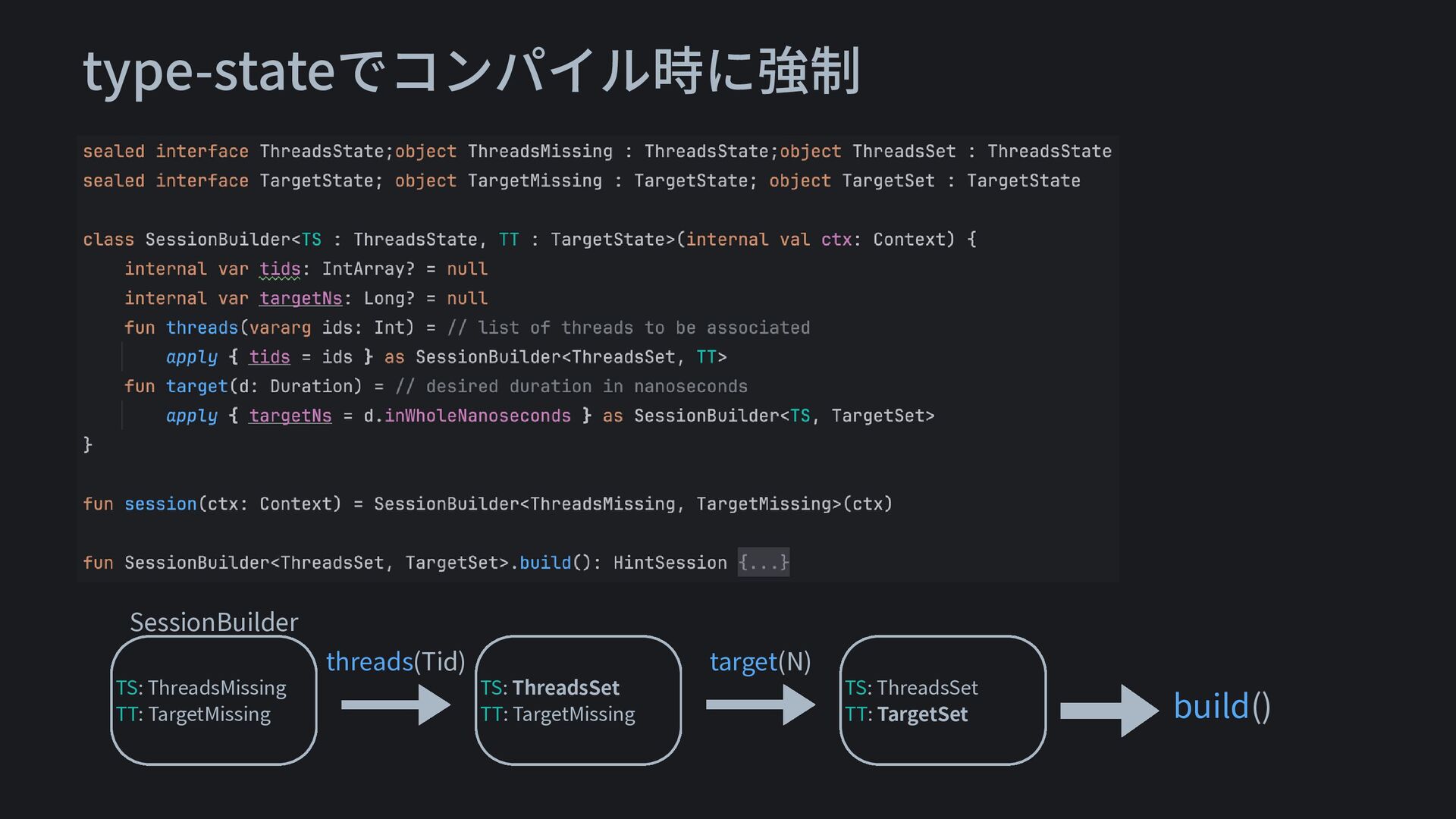 type-stateでコンパイル時に強制 TS: ThreadsMissing TT: TargetMissing threads(Tid) TS: ThreadsSet TT: TargetMissing