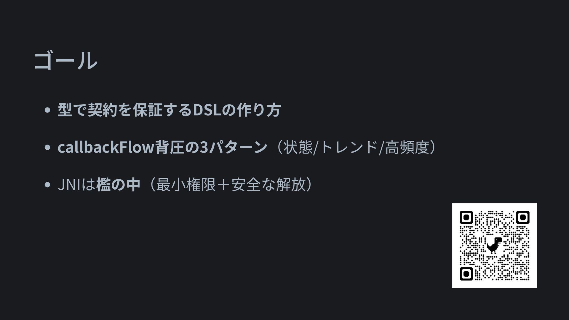 • 型で契約を保証するDSLの作り方 • callbackFlow背圧の3パターン(状態/トレンド/高頻度) • JNIは檻の中(最小権限+安全な解放) ゴール