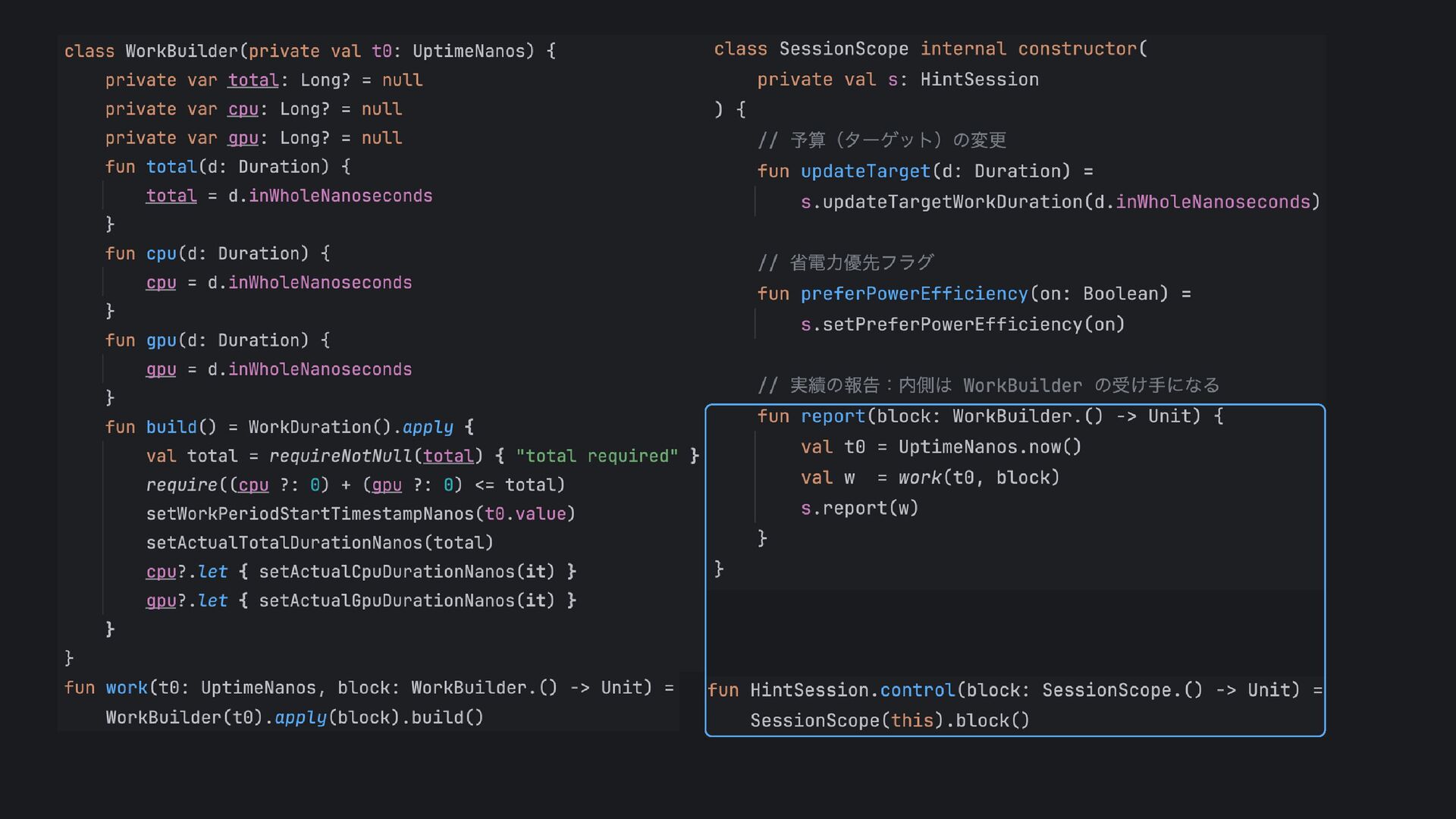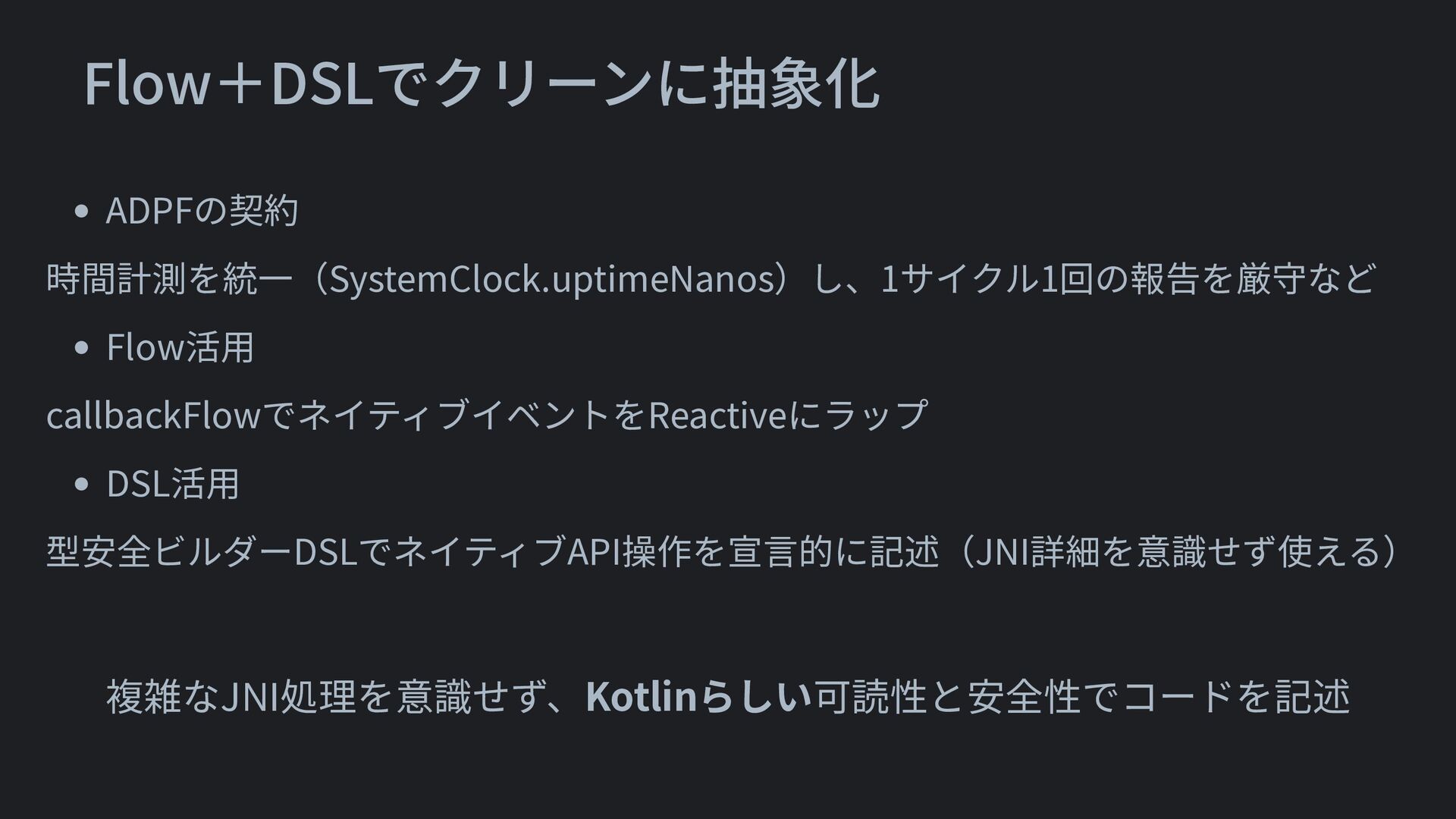 • ADPFの契約 時間計測を統一(SystemClock.uptimeNanos)し、1サイクル1回の報告を厳守など • Flow活用 callbackFlowでネイティブイベントをReactiveにラップ • DSL活用 型安全ビルダーDSLでネイティブAPI操作を宣言的に記述(JNI詳細を意識せず使える) Flow+DSLでクリーンに抽象化