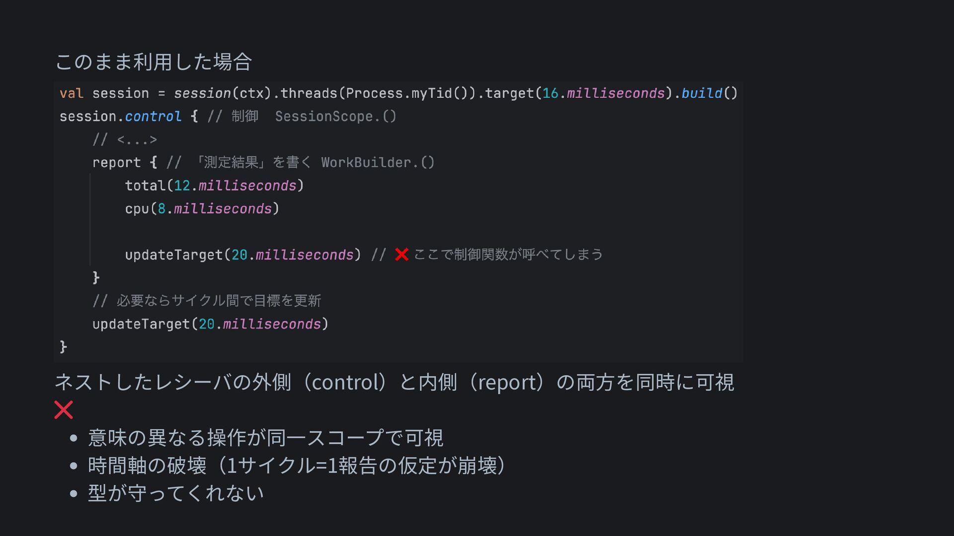ネストしたレシーバの外側(control)と内側(report)の両方を同時に可視 • 意味の異なる操作が同一スコープで可視 • 時間軸の破壊(1サイクル=1報告の仮定が崩壊) • 型が守ってくれない このまま利用した場合
