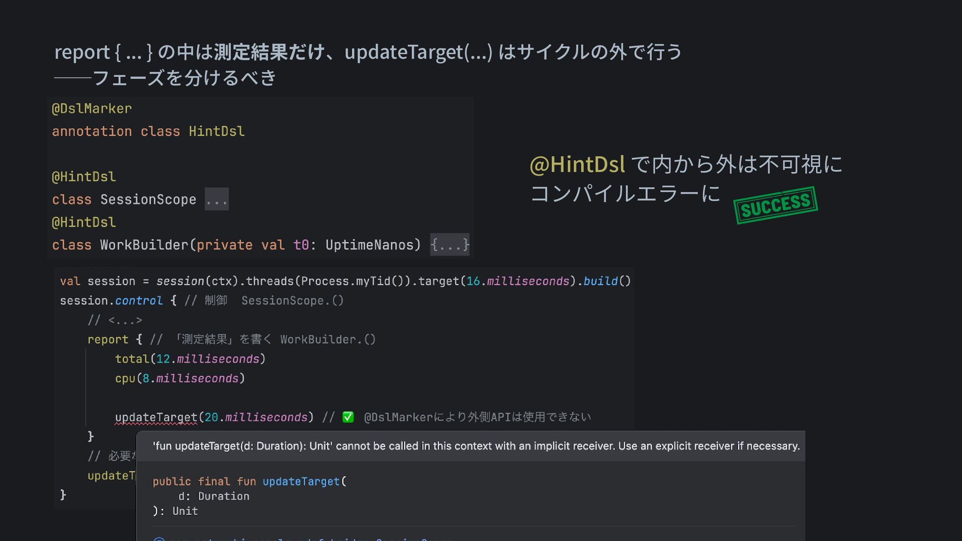 report { ... } の中は測定結果だけ、updateTarget(...) はサイクルの外で行う ──フェーズを分けるべき @HintDsl で内から外は不可視に コンパイルエラーに