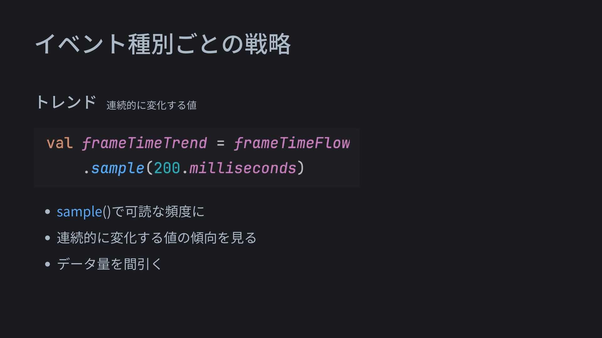 イベント種別ごとの戦略 • sample()で可読な頻度に • 連続的に変化する値の傾向を見る • データ量を間引く トレンド 連続的に変化する値