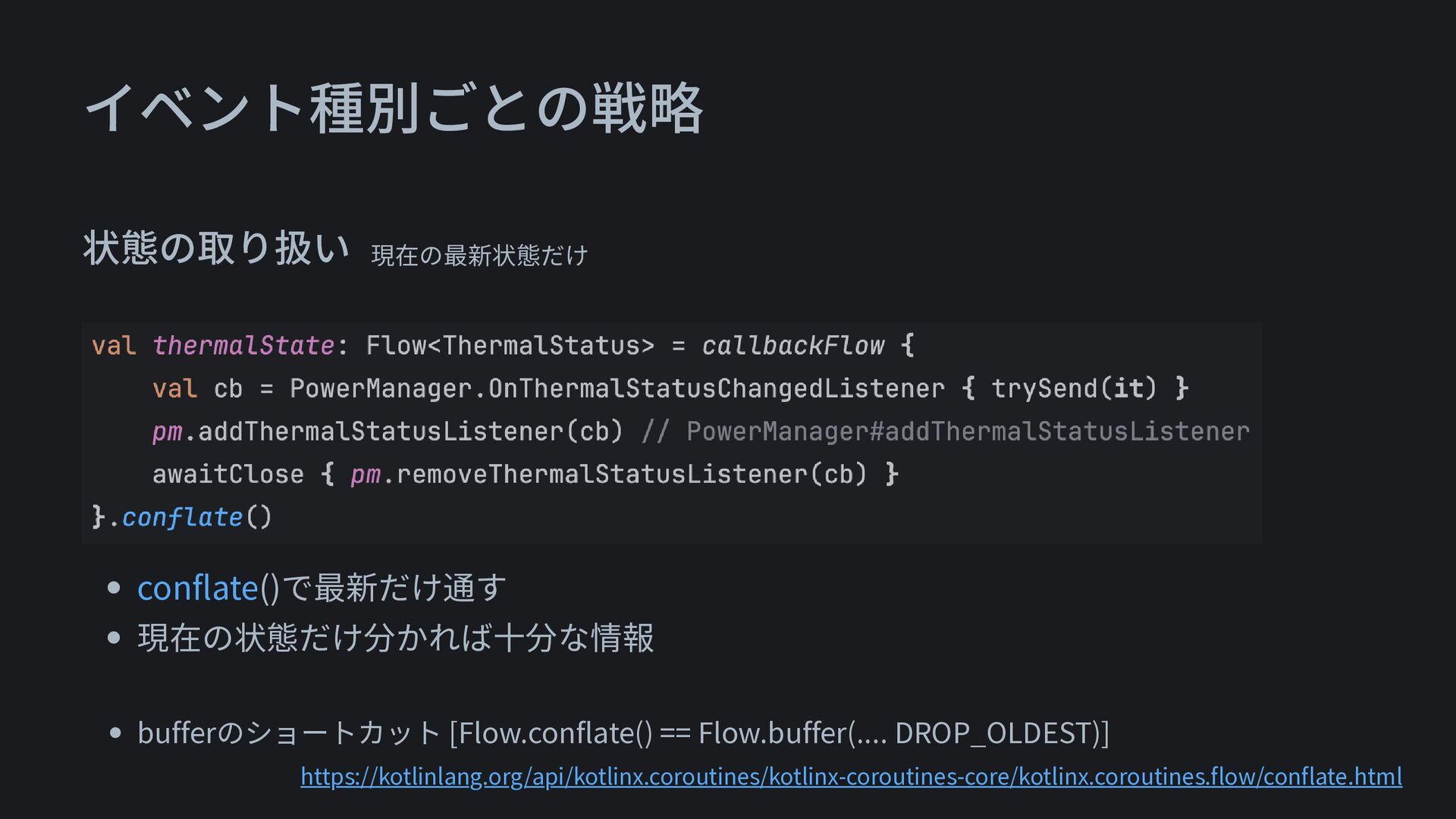 • conflate()で最新だけ通す • 現在の状態だけ分かれば十分な情報 イベント種別ごとの戦略 状態の取り扱い 現在の最新状態だけ • bufferのショートカット [Flow.conflate()