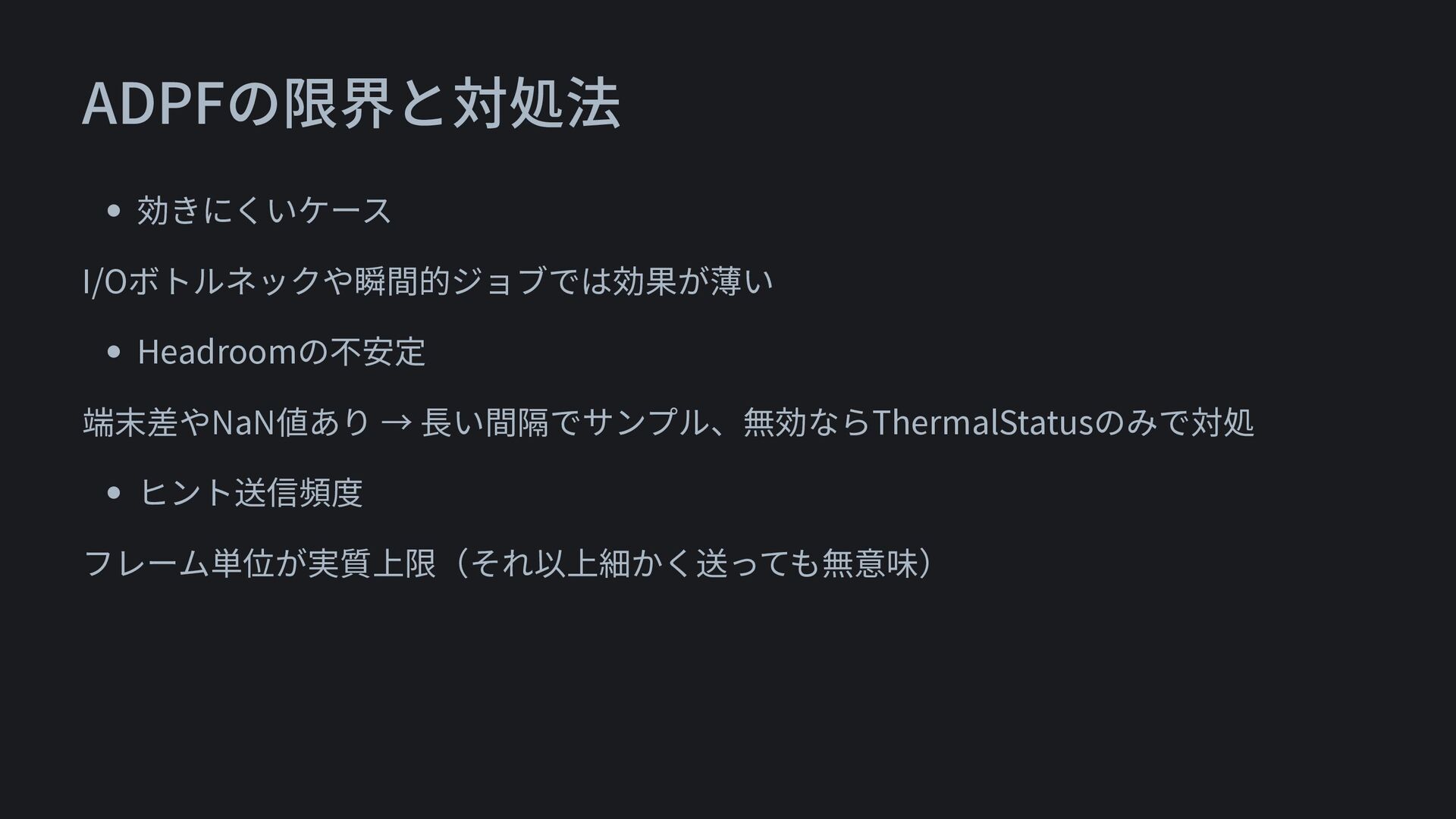 ADPFの限界と対処法 • 効きにくいケース I/Oボトルネックや瞬間的ジョブでは効果が薄い • Headroomの不安定 端末差やNaN値あり → 長い間隔でサンプル、無効ならThermalStatusのみで対処 •