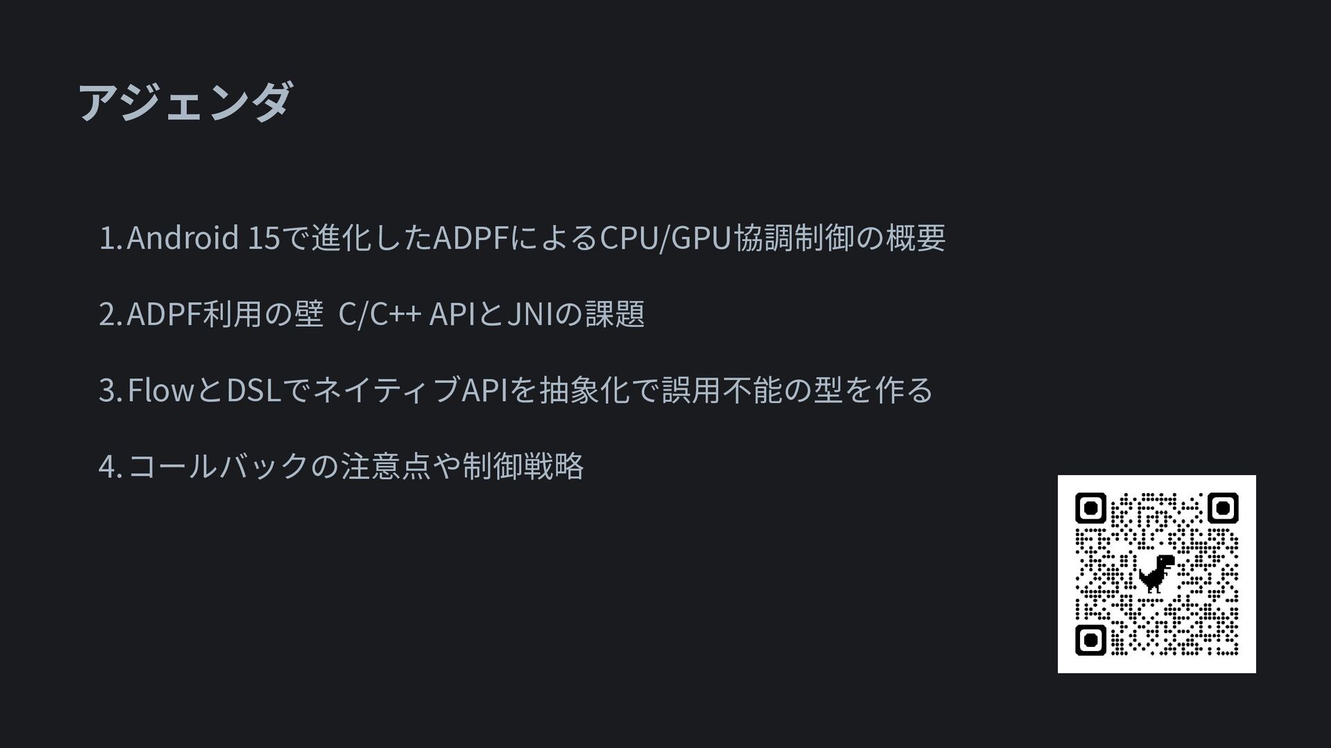 1.Android 15で進化したADPFによるCPU/GPU協調制御の概要 2.ADPF利用の壁 C/C++ APIとJNIの課題 3.FlowとDSLでネイティブAPIを抽象化で誤用不能の型を作る 4.コールバックの注意点や制御戦略 アジェンダ