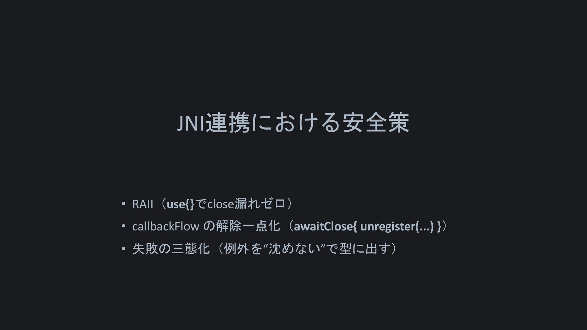 JNI連携における安全策 • RAII(use{}でclose漏れゼロ) • callbackFlow の解除一点化(awaitClose{ unregister(...) }) • 失敗の三態化(例外を“沈めない”で型に出す)