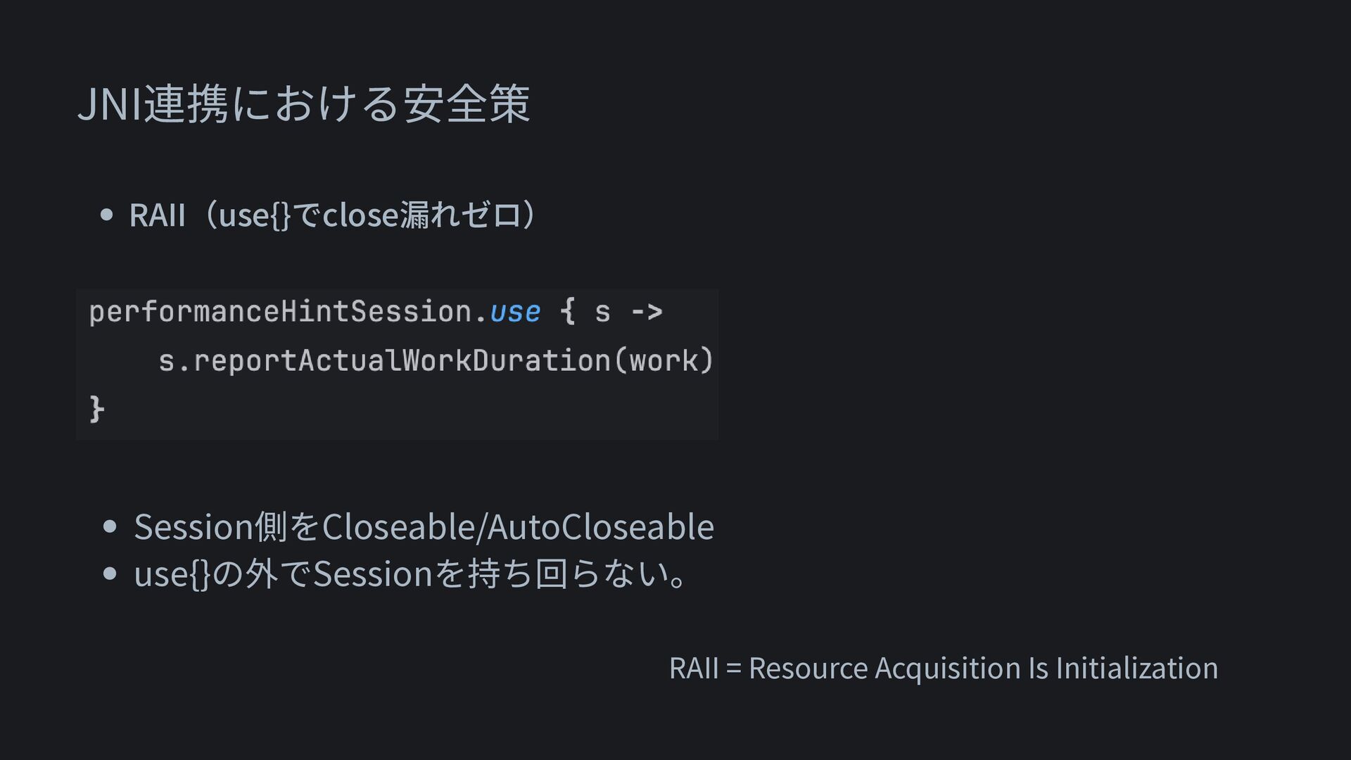 JNI連携における安全策 • RAII(use{}でclose漏れゼロ) • Session側をCloseable/AutoCloseable • use{}の外でSessionを持ち回らない。 RAII = Resource