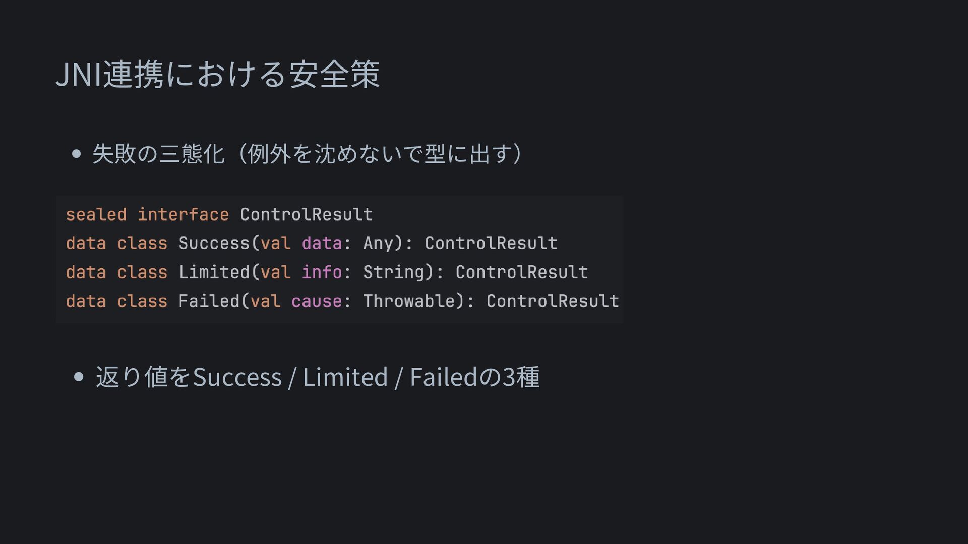 JNI連携における安全策 • 失敗の三態化(例外を沈めないで型に出す) • 返り値を3種に • Success: 想定した挙動 • Limited: