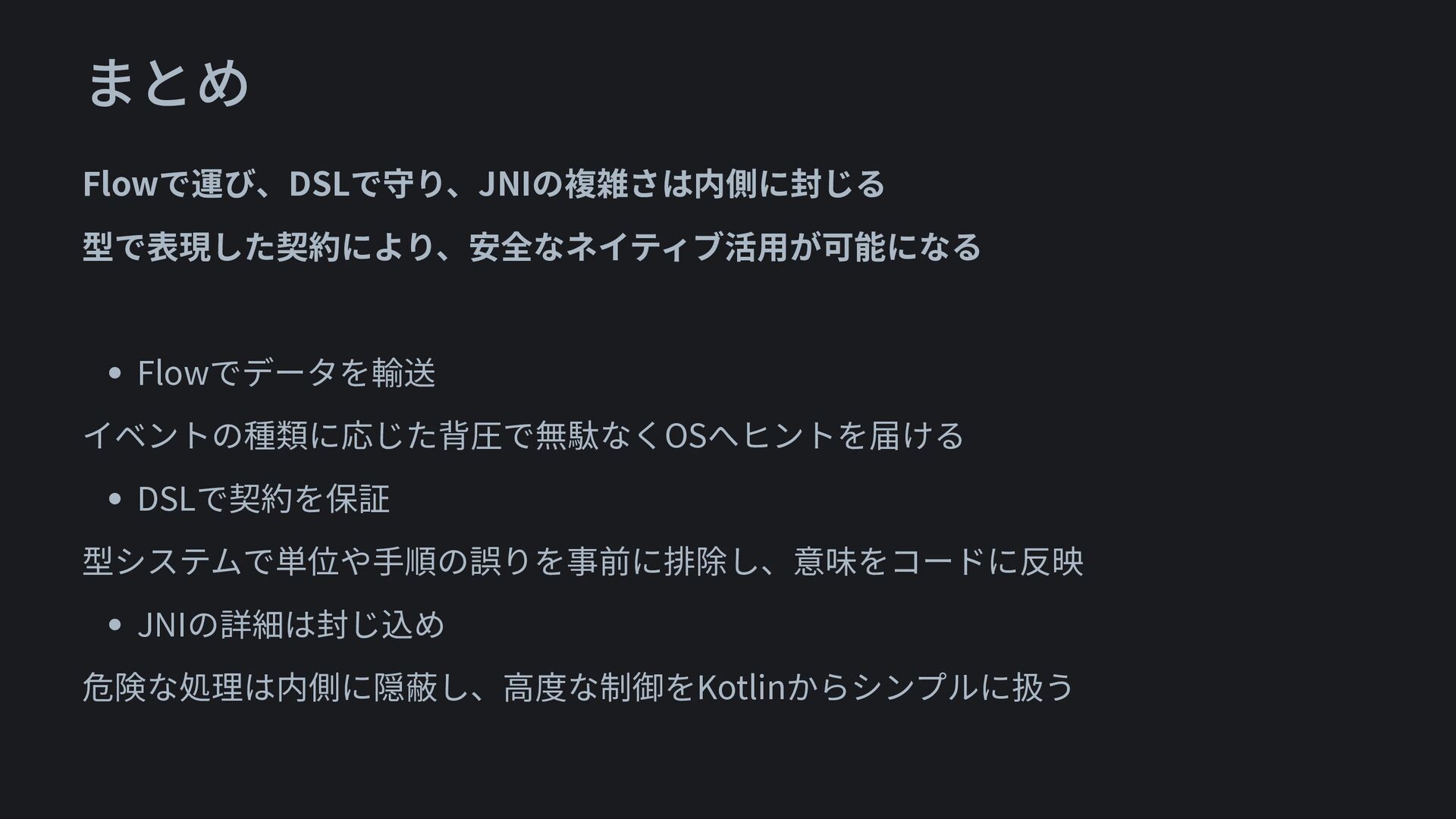 まとめ Flowで運び、DSLで守り、JNIの複雑さは内側に封じる 型で表現した契約により、安全なネイティブ活用が可能になる • Flowでデータを輸送 イベントの種類に応じた背圧で無駄なくOSへヒントを届ける • DSLで契約を保証 型システムで単位や手順の誤りを事前に排除し、意味をコードに反映 •