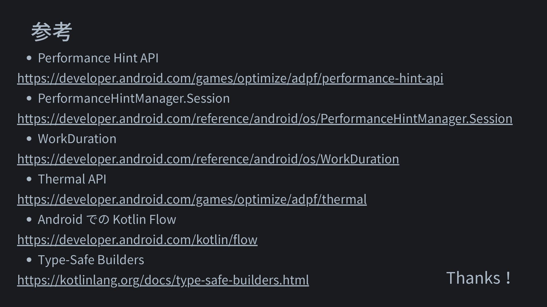 WorkDuration https://developer.android.com/reference/android/os/WorkDuration • Thermal API https://developer.android.com/games/optimize/adpf/thermal • Kotlin Flow https://developer.android.com/kotlin/flow • Type-Safe Builders https://kotlinlang.org/docs/type-safe-builders.html Thanks!