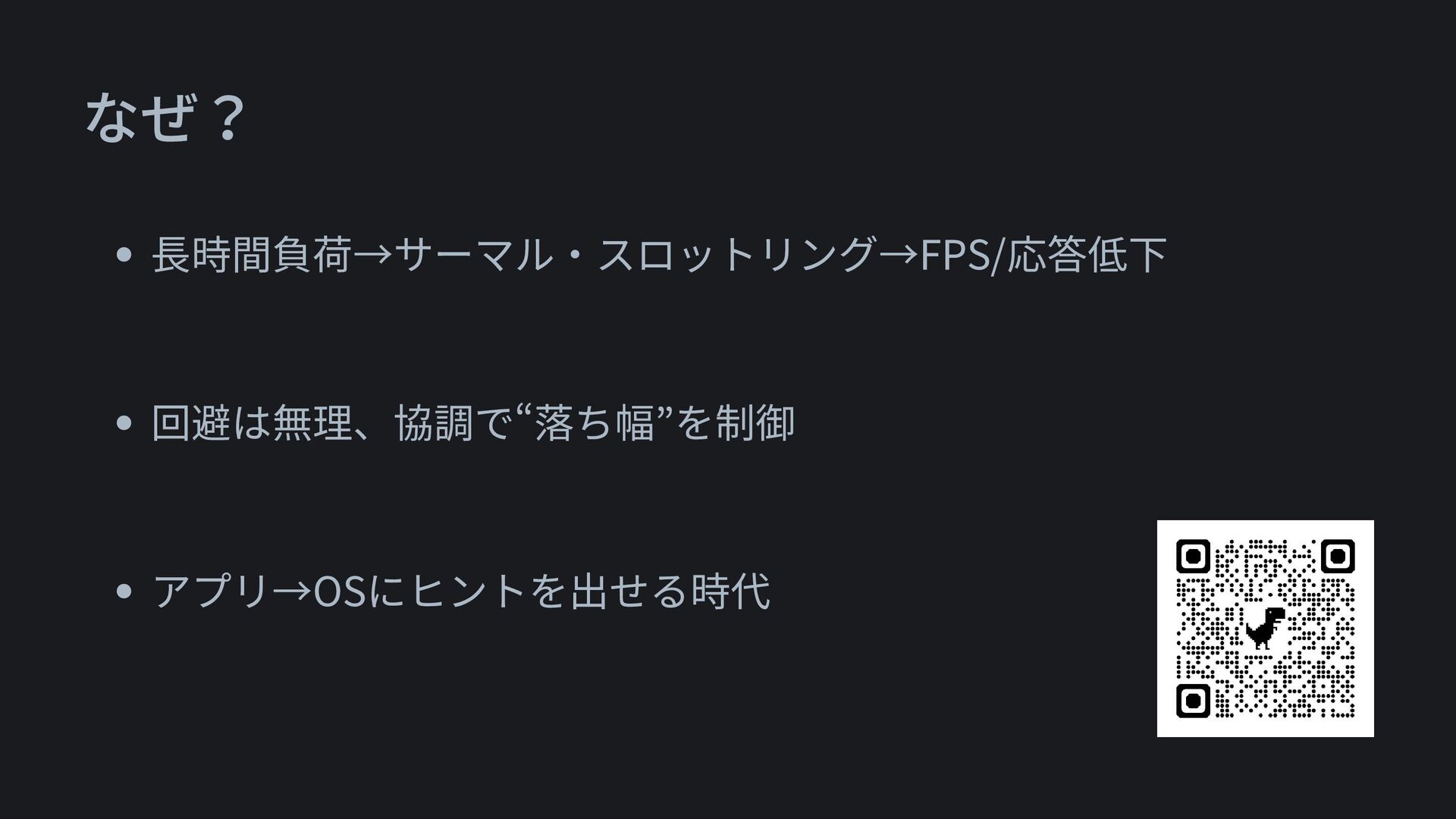 なぜ? • 長時間負荷→サーマル・スロットリング→FPS/応答低下 • 回避は無理、協調で“落ち幅”を制御 • アプリ → ADPF →OSにヒントを出せる時代