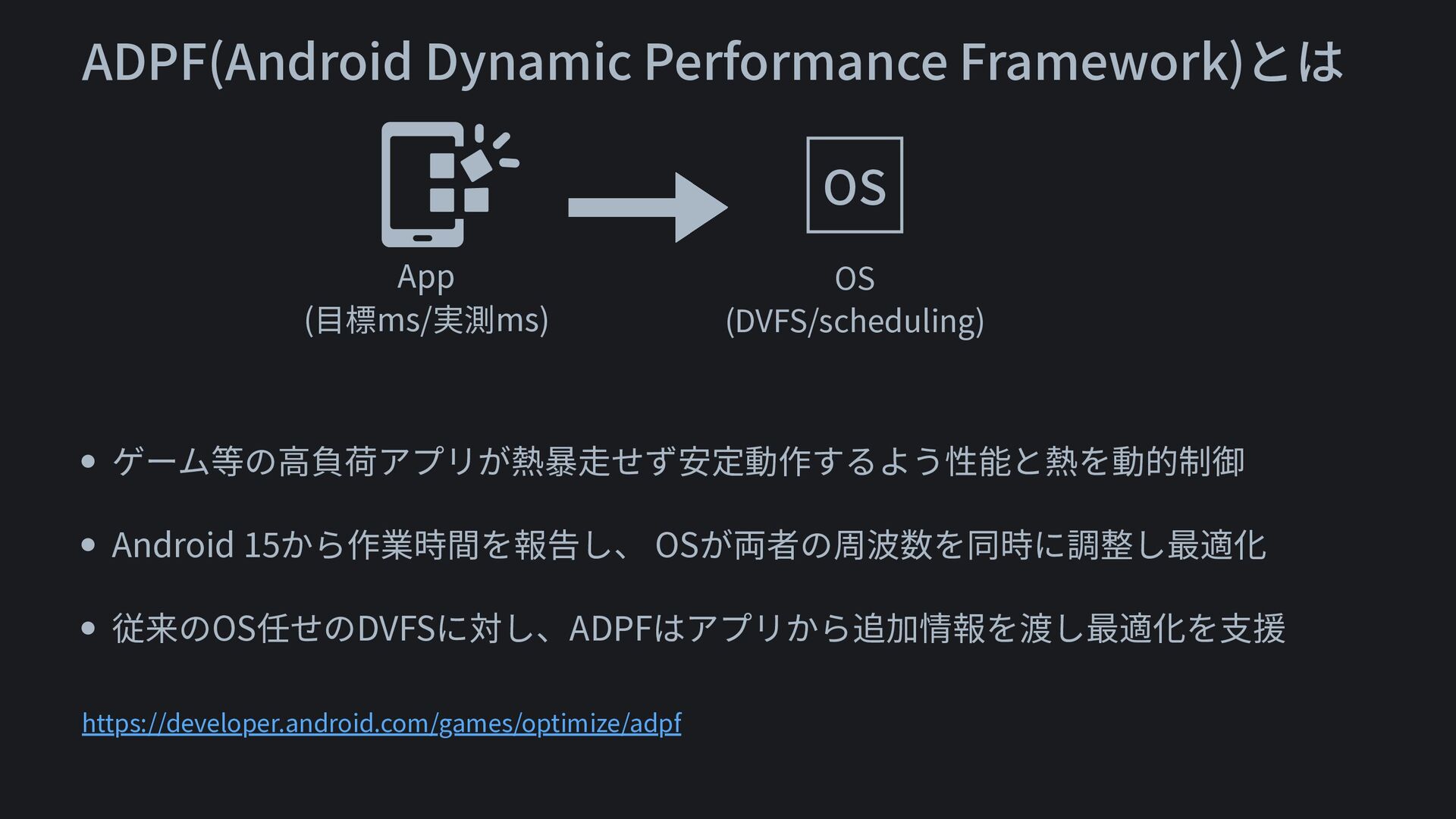 ゲーム等の高負荷アプリが熱暴走せず安定動作するよう性能と熱を動的制御 • Android 15から作業時間を報告し、 OSが両者の周波数を同時に調整し最適化 • 従来のOS任せのDVFSに対し、ADPFはアプリから追加情報を渡し最適化を支援 https://developer.android.com/games/optimize/adpf https://source.android.com/docs/core/power/performance