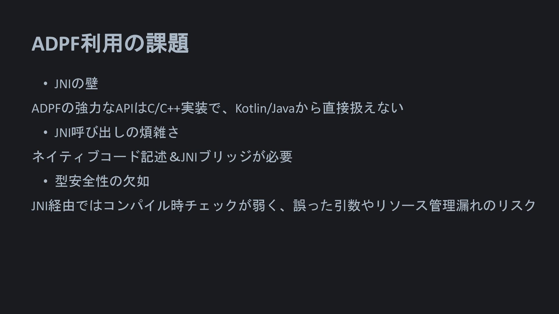 ADPF利用の課題 • JNIの壁 ADPFの強力なAPIはC/C++実装で、Kotlin/Javaから直接扱えない • JNI呼び出しの煩雑さ ネイティブコード記述&JNIブリッジが必要 • 型安全性の欠如 JNI経由ではコンパイル時チェックが弱く、誤った引数やリソース管理漏れのリスク