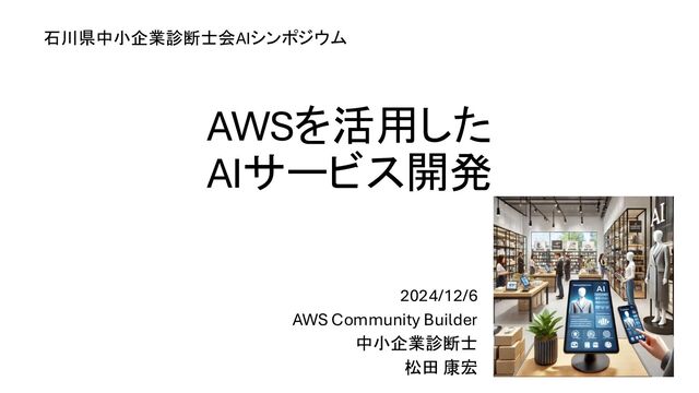 AWSを活用した AIサービス開発 2024/12/6 AWS Community Builder 中小企業診断士 松田 康宏 石川県中小企業診断士会AIシンポジウム