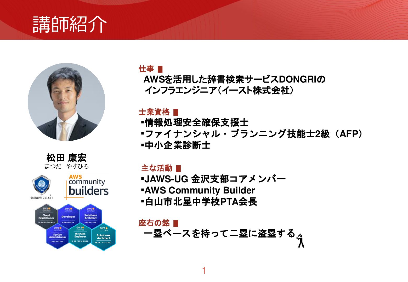 康宏 まつだ やすひろ 仕事 ▮ AWSを活用した辞書検索サービスDONGRIの インフラエンジニア(イースト株式会社) 士業資格 ▮ 情報処理安全確保支援士 ファイナンシャル・プランニング技能士2級(AFP) 中小企業診断士 主な活動 ▮ JAWS-UG 金沢支部コアメンバー AWS Community Builder 白山市北星中学校PTA会長 座右の銘 ▮ 一塁ベースを持って二塁に盗塁する