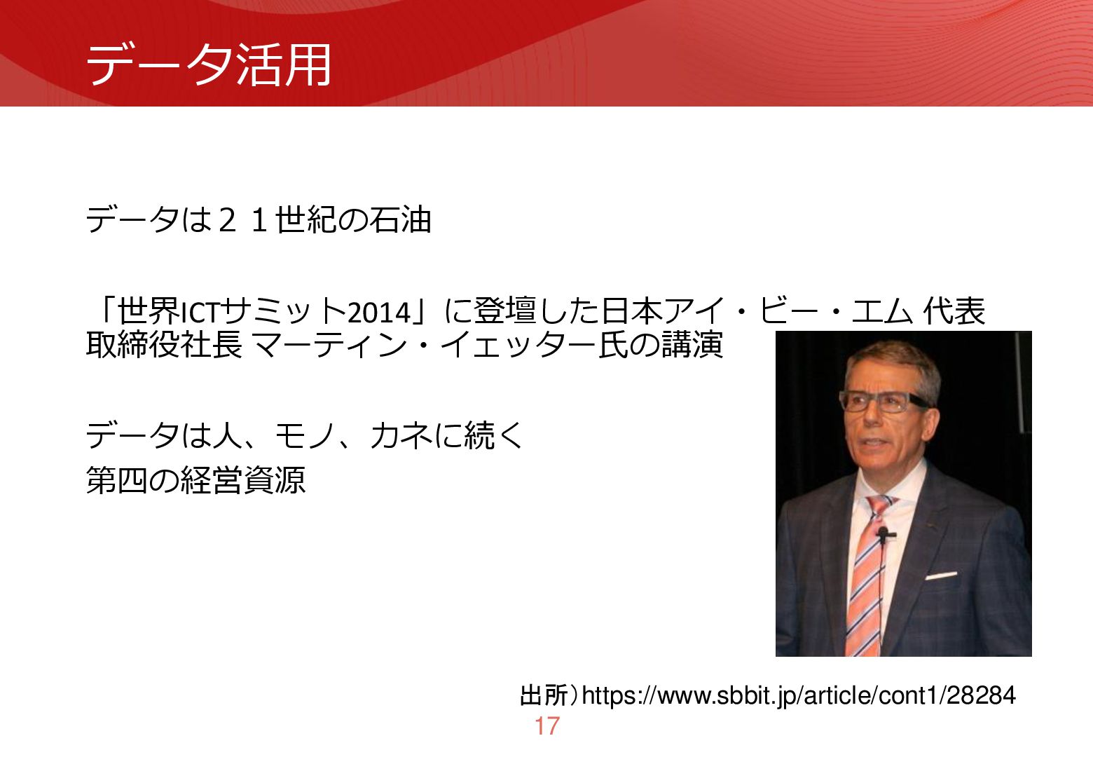 「世界ICTサミット2014」に登壇した日本アイ・ビー・エム 代表 取締役社長 マーティン・イェッター氏の講演 データは人、モノ、カネに続く 第四の経営資源 出所)https://www.sbbit.jp/article/cont1/28284