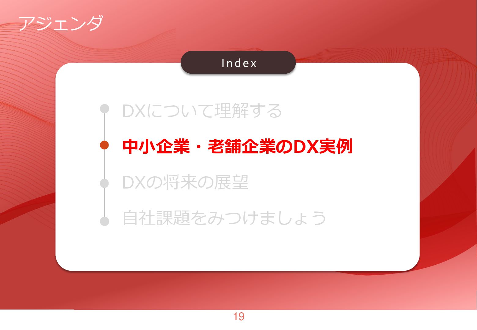 i’s FACTORY co., Limited index index I ndex アジェンダ 19 DXについて理解する 中小企業・老舗企業のDX実例 DXの将来の展望 自社課題をみつけましょう