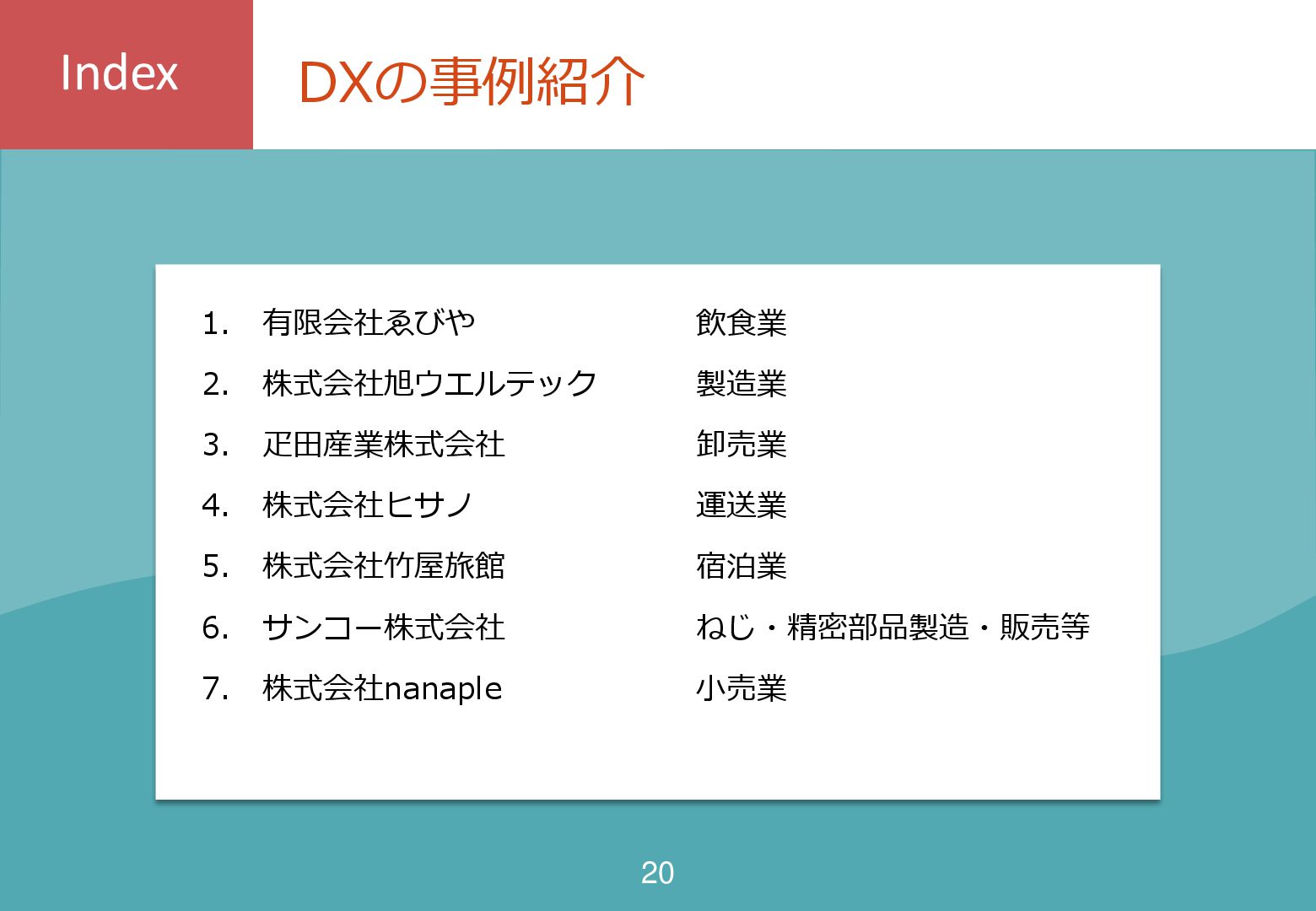 飲食業 2. 株式会社旭ウエルテック 製造業 3. 疋田産業株式会社 卸売業 4. 株式会社ヒサノ 運送業 5. 株式会社竹屋旅館 宿泊業 6. サンコー株式会社 ねじ・精密部品製造・販売等 7. 株式会社nanaple 小売業 Index 20