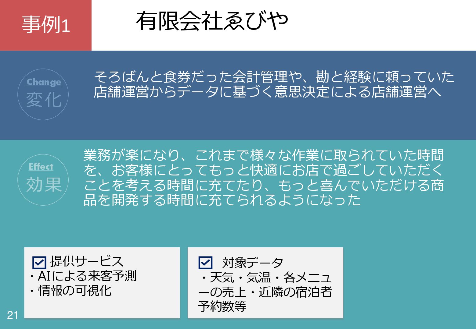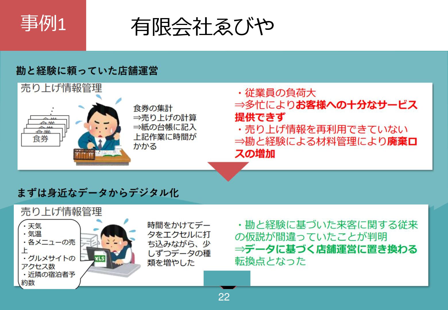 効果 21 有限会社ゑびや そろばんと食券だった会計管理や、勘と経験に頼っていた 店舗運営からデータに基づく意思決定による店舗運営へ 事例1 業務が楽になり、これまで様々な作業に取られていた時間 を、お客様にとってもっと快適にお店で過ごしていただく ことを考える時間に充てたり、もっと喜んでいただける商 品を開発する時間に充てられるようになった 提供サービス ・AIによる来客予測 ・情報の可視化 対象データ ・天気・気温・各メニュ ーの売上・近隣の宿泊者 予約数等