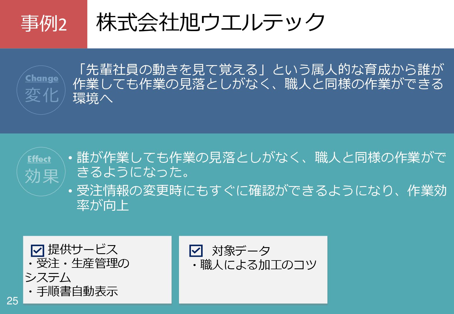 効果 25 株式会社旭ウエルテック 事例2 • 誰が作業しても作業の見落としがなく、職人と同様の作業がで きるようになった。 • 受注情報の変更時にもすぐに確認ができるようになり、作業効 率が向上 提供サービス ・受注・生産管理の システム ・手順書自動表示 対象データ ・職人による加工のコツ 「先輩社員の動きを見て覚える」という属人的な育成から誰が 作業しても作業の見落としがなく、職人と同様の作業ができる 環境へ