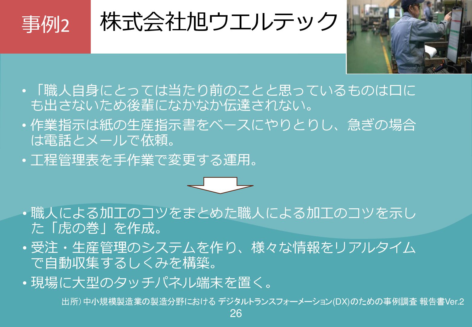 「職人自身にとっては当たり前のことと思っているものは口に も出さないため後輩になかなか伝達されない。 • 作業指示は紙の生産指示書をベースにやりとりし、急ぎの場合 は電話とメールで依頼。 • 工程管理表を手作業で変更する運用。 事例2 • 職人による加工のコツをまとめた職人による加工のコツを示し た「虎の巻」を作成。 • 受注・生産管理のシステムを作り、様々な情報をリアルタイム で自動収集するしくみを構築。 • 現場に大型のタッチパネル端末を置く。 出所)中小規模製造業の製造分野における デジタルトランスフォーメーション(DX)のための事例調査 報告書Ver.2