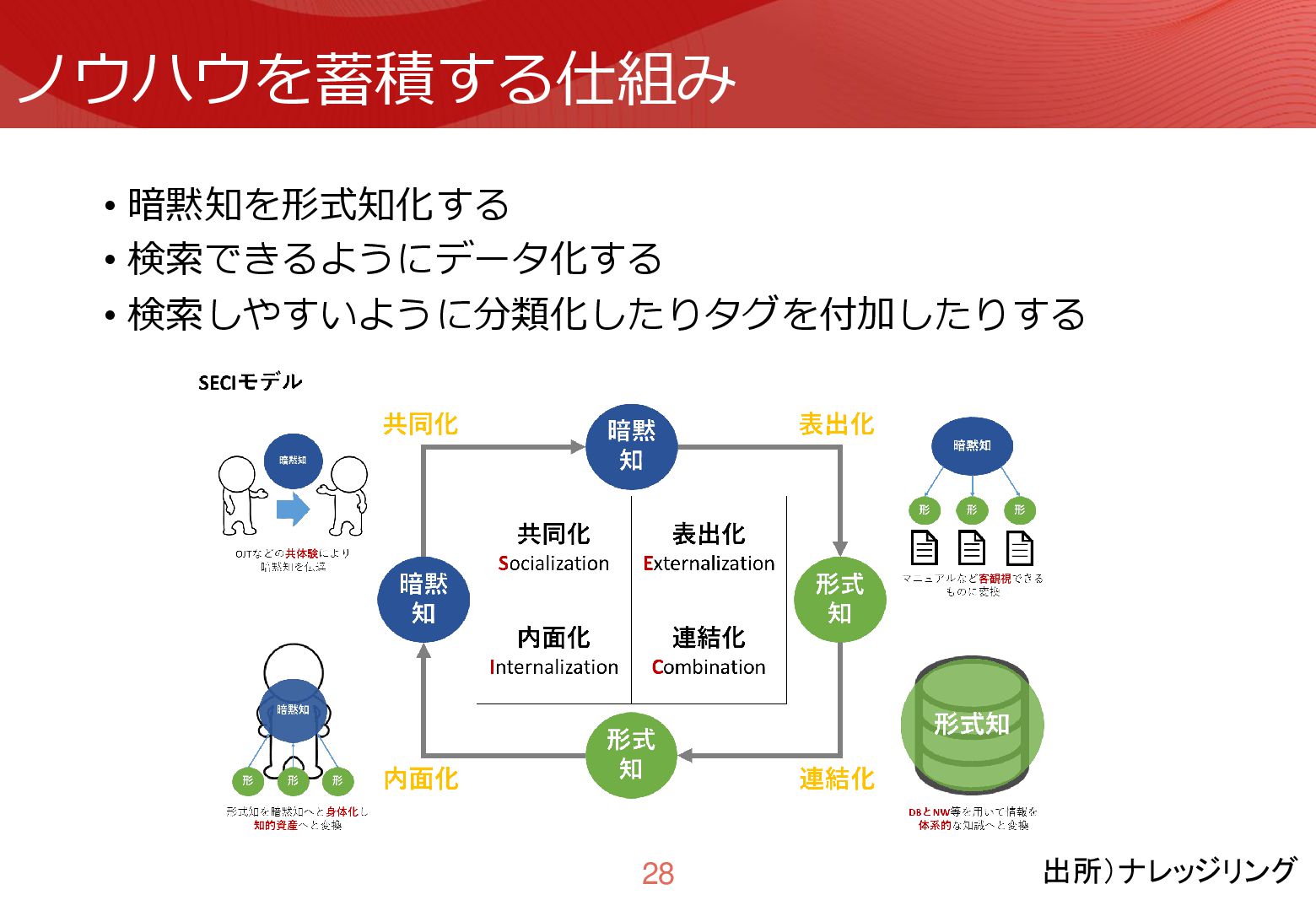 暗黙知を形式知化する • 検索できるようにデータ化する • 検索しやすいように分類化したりタグを付加したりする 出所)ナレッジリング