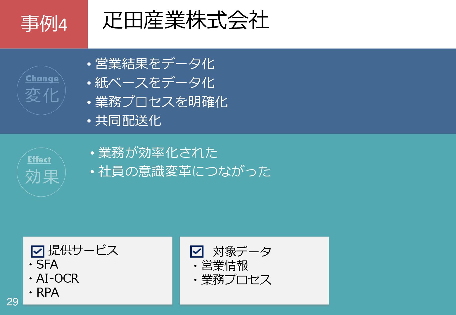 効果 29 疋田産業株式会社 事例4 • 営業結果をデータ化 • 紙ベースをデータ化 • 業務プロセスを明確化 • 共同配送化 • 業務が効率化された • 社員の意識変革につながった 提供サービス ・SFA ・AI-OCR ・RPA 対象データ ・営業情報 ・業務プロセス