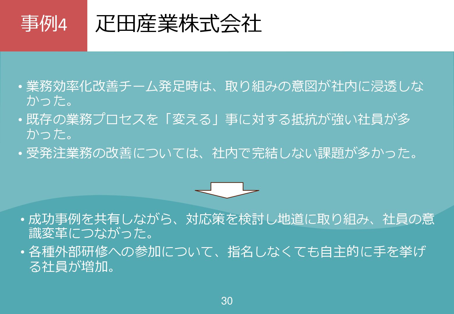 • 業務効率化改善チーム発足時は、取り組みの意図が社内に浸透しな かった。 • 既存の業務プロセスを「変える」事に対する抵抗が強い社員が多 かった。 • 受発注業務の改善については、社内で完結しない課題が多かった。 • 成功事例を共有しながら、対応策を検討し地道に取り組み、社員の意 識変革につながった。 • 各種外部研修への参加について、指名しなくても自主的に手を挙げ る社員が増加。