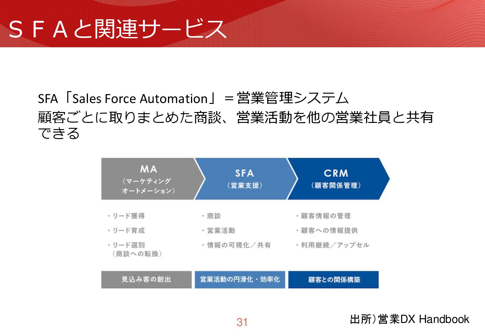 Force Automation」=営業管理システム 顧客ごとに取りまとめた商談、営業活動を他の営業社員と共有 できる 出所)営業DX Handbook