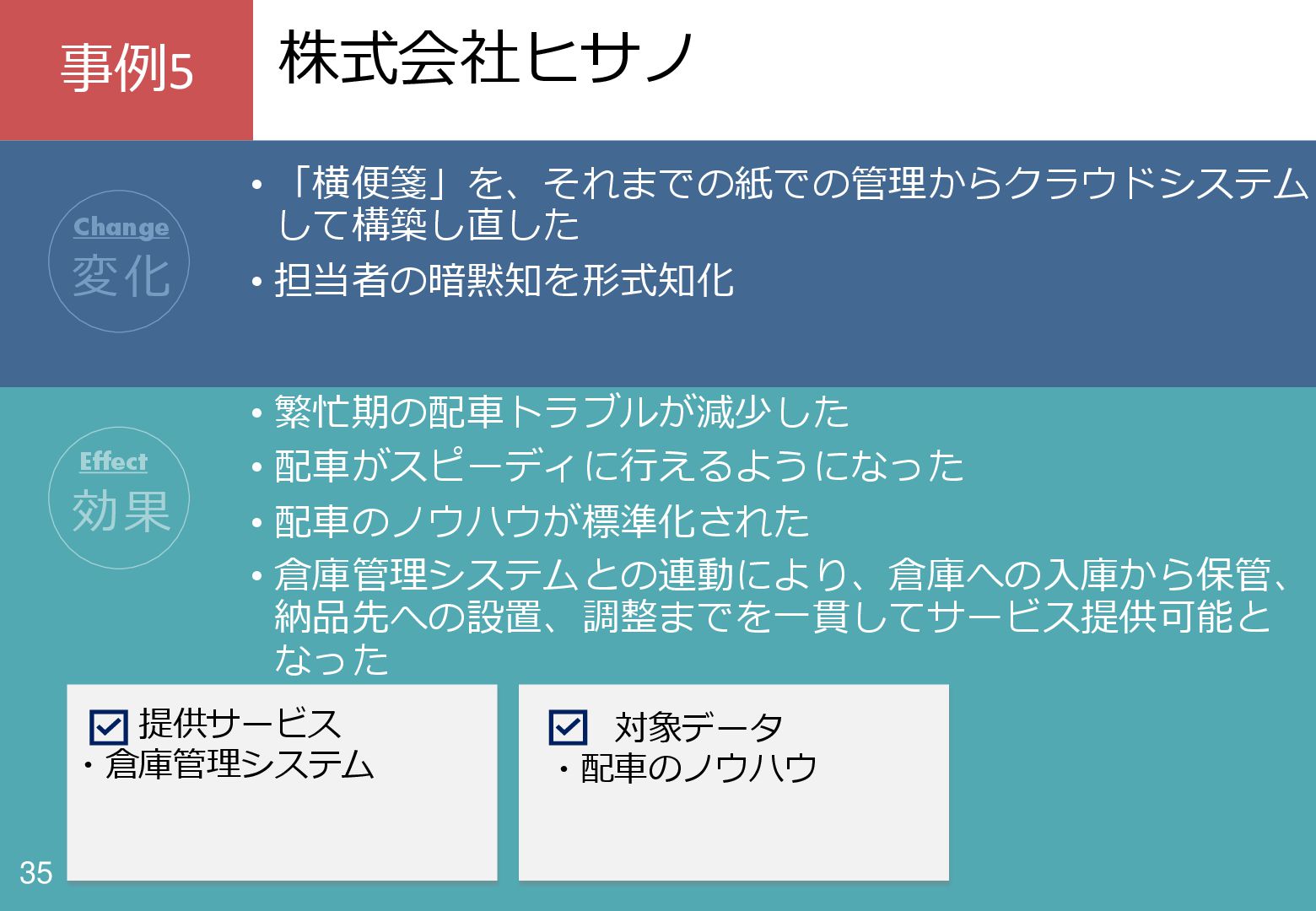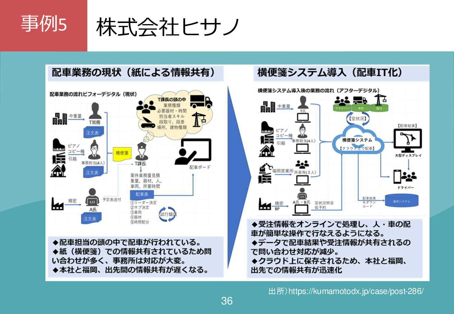 効果 35 株式会社ヒサノ 事例5 • 「横便箋」を、それまでの紙での管理からクラウドシステムと して構築し直した • 担当者の暗黙知を形式知化 • 繁忙期の配車トラブルが減少した • 配車がスピーディに行えるようになった • 配車のノウハウが標準化された • 倉庫管理システムとの連動により、倉庫への入庫から保管、 納品先への設置、調整までを一貫してサービス提供可能と なった 提供サービス ・倉庫管理システム 対象データ ・配車のノウハウ