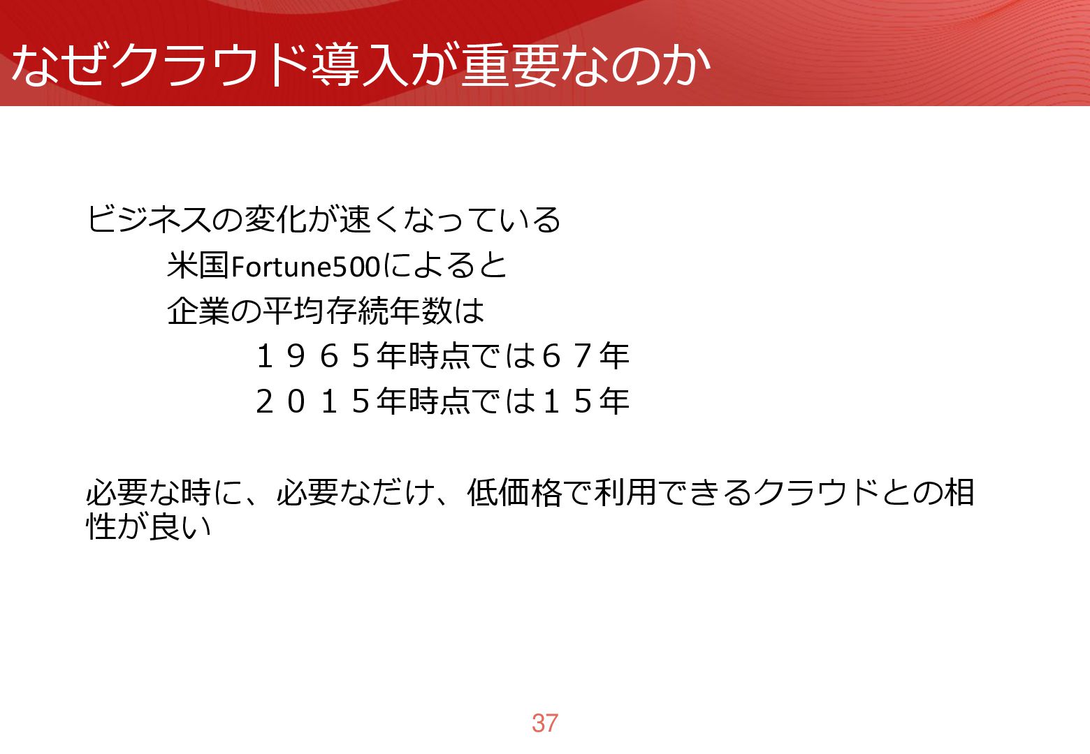 米国Fortune500によると 企業の平均存続年数は 1965年時点では67年 2015年時点では15年 必要な時に、必要なだけ、低価格で利用できるクラウドとの相 性が良い