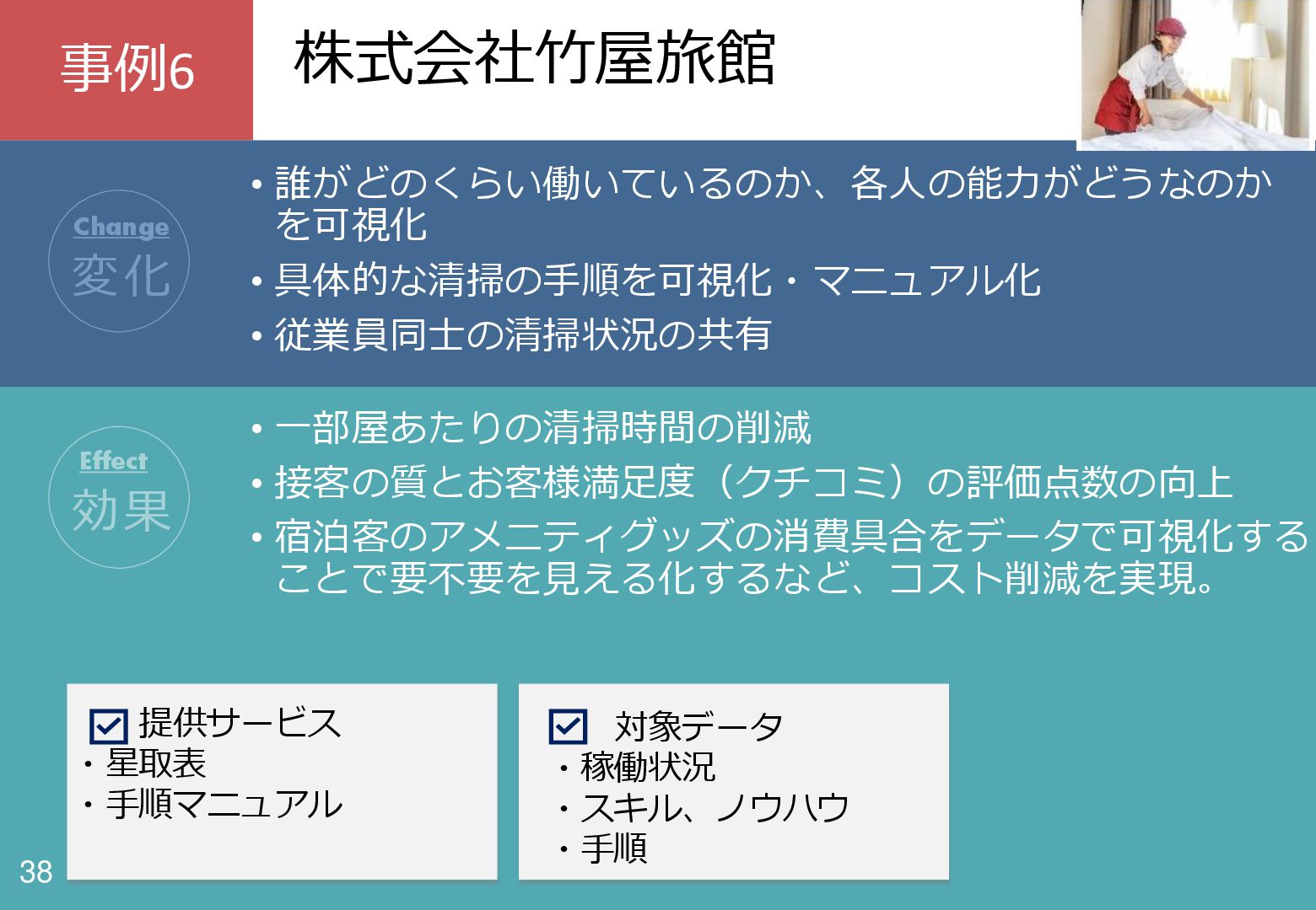 効果 38 株式会社竹屋旅館 事例6 • 誰がどのくらい働いているのか、各人の能力がどうなのか を可視化 • 具体的な清掃の手順を可視化・マニュアル化 • 従業員同士の清掃状況の共有 • 一部屋あたりの清掃時間の削減 • 接客の質とお客様満足度(クチコミ)の評価点数の向上 • 宿泊客のアメニティグッズの消費具合をデータで可視化する ことで要不要を見える化するなど、コスト削減を実現。 提供サービス ・星取表 ・手順マニュアル 対象データ ・稼働状況 ・スキル、ノウハウ ・手順