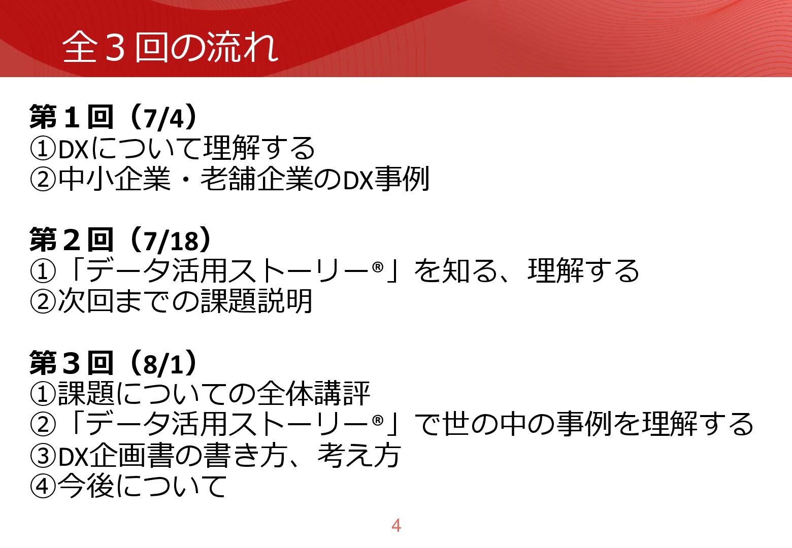 ①DXについて理解する ②中小企業・老舗企業のDX事例 第2回(7/18) ①「データ活用ストーリー®」を知る、理解する ②次回までの課題説明 第3回(8/1) ①課題についての全体講評 ②「データ活用ストーリー®」で世の中の事例を理解する ③DX企画書の書き方、考え方 ④今後について