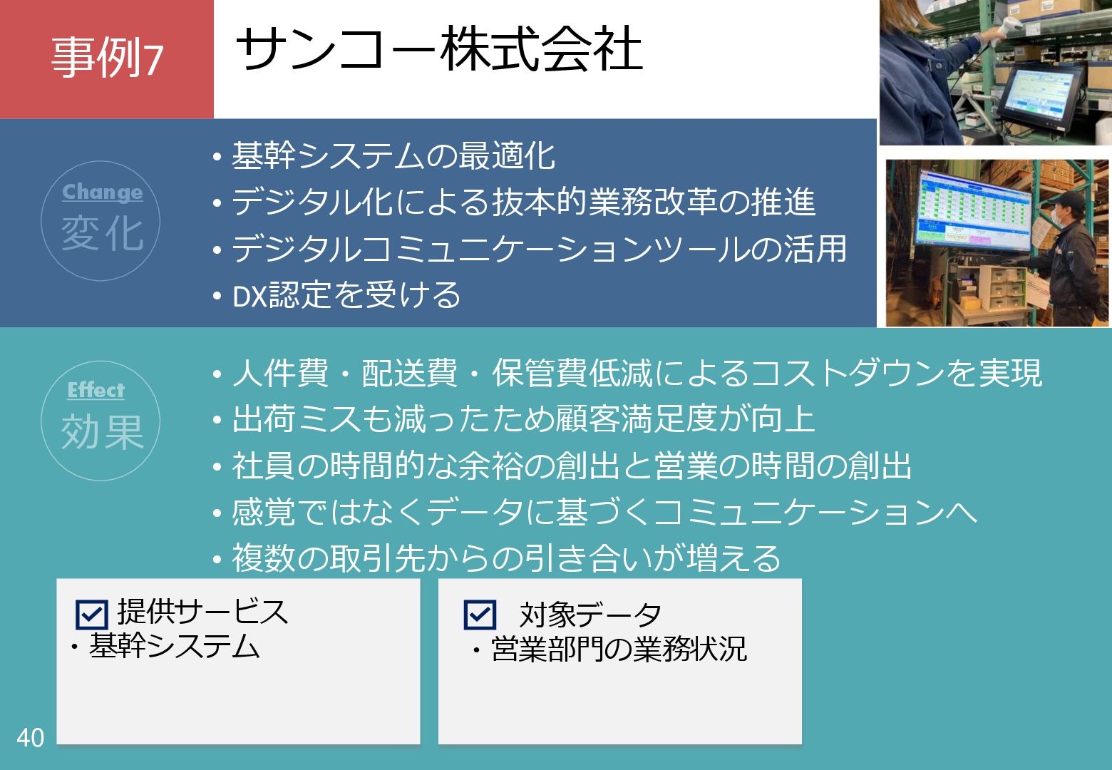 効果 40 サンコー株式会社 事例7 • 基幹システムの最適化 • デジタル化による抜本的業務改革の推進 • デジタルコミュニケーションツールの活用 • DX認定を受ける • 人件費・配送費・保管費低減によるコストダウンを実現 • 出荷ミスも減ったため顧客満足度が向上 • 社員の時間的な余裕の創出と営業の時間の創出 • 感覚ではなくデータに基づくコミュニケーションへ • 複数の取引先からの引き合いが増える 提供サービス ・基幹システム 対象データ ・営業部門の業務状況