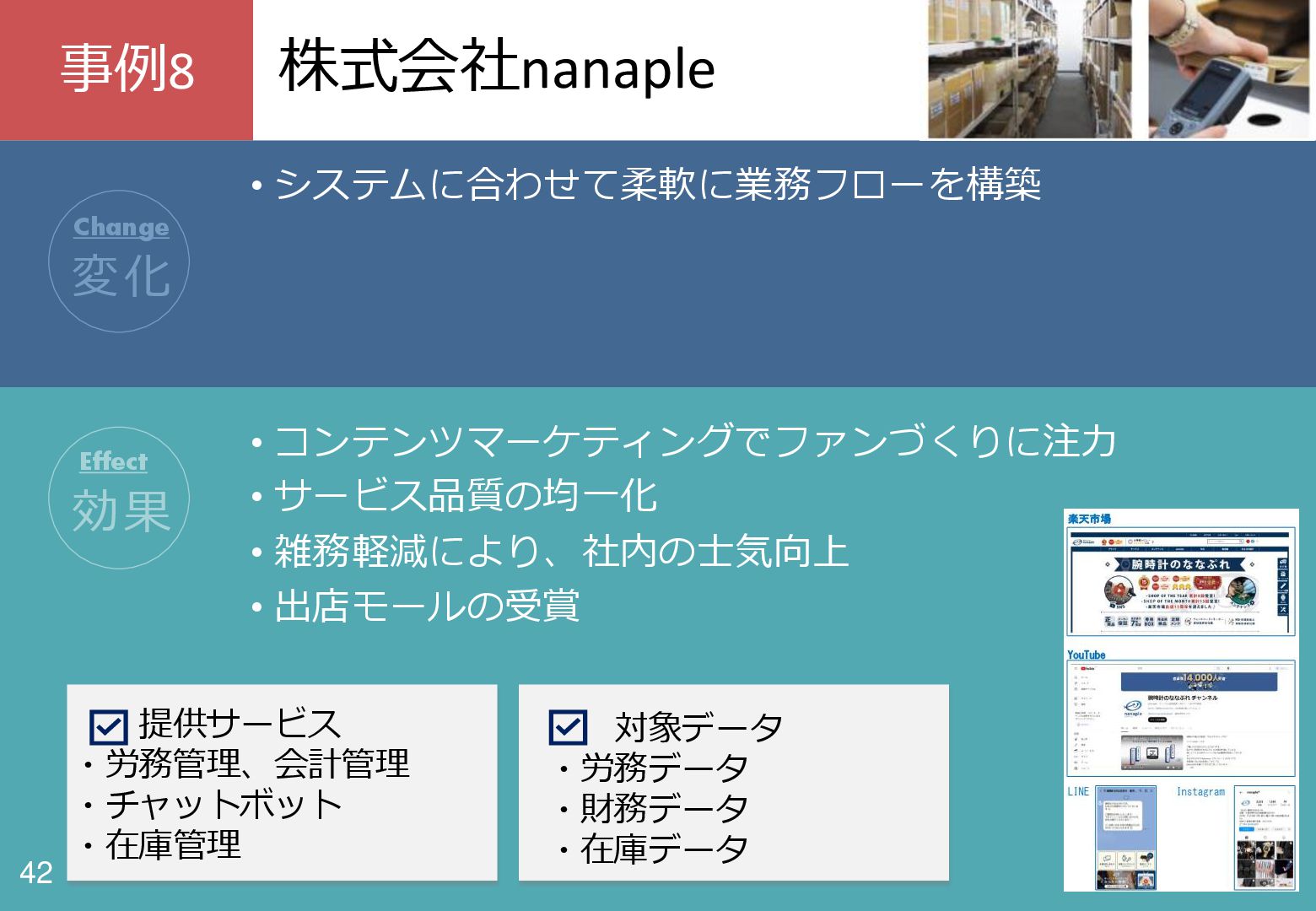効果 42 株式会社nanaple 事例8 • システムに合わせて柔軟に業務フローを構築 • コンテンツマーケティングでファンづくりに注力 • サービス品質の均一化 • 雑務軽減により、社内の士気向上 • 出店モールの受賞 提供サービス ・労務管理、会計管理 ・チャットボット ・在庫管理 対象データ ・労務データ ・財務データ ・在庫データ
