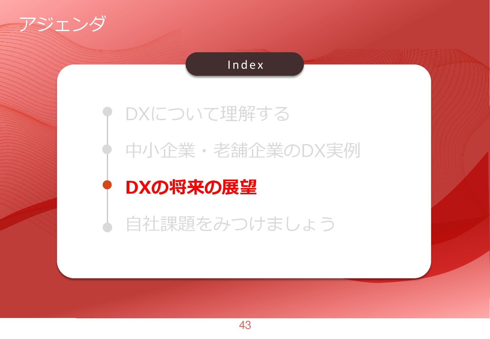 i’s FACTORY co., Limited index index I ndex アジェンダ 43 DXについて理解する 中小企業・老舗企業のDX実例 DXの将来の展望 自社課題をみつけましょう