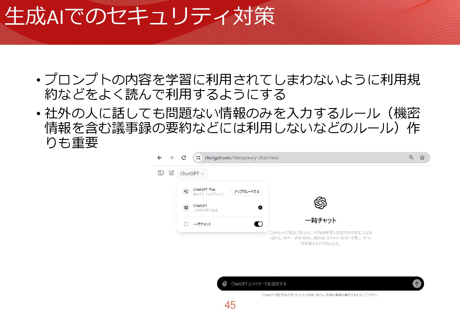 © 2023 i’s FACTORY co., Limited Confidential 45 生成AIでのセキュリティ対策 •