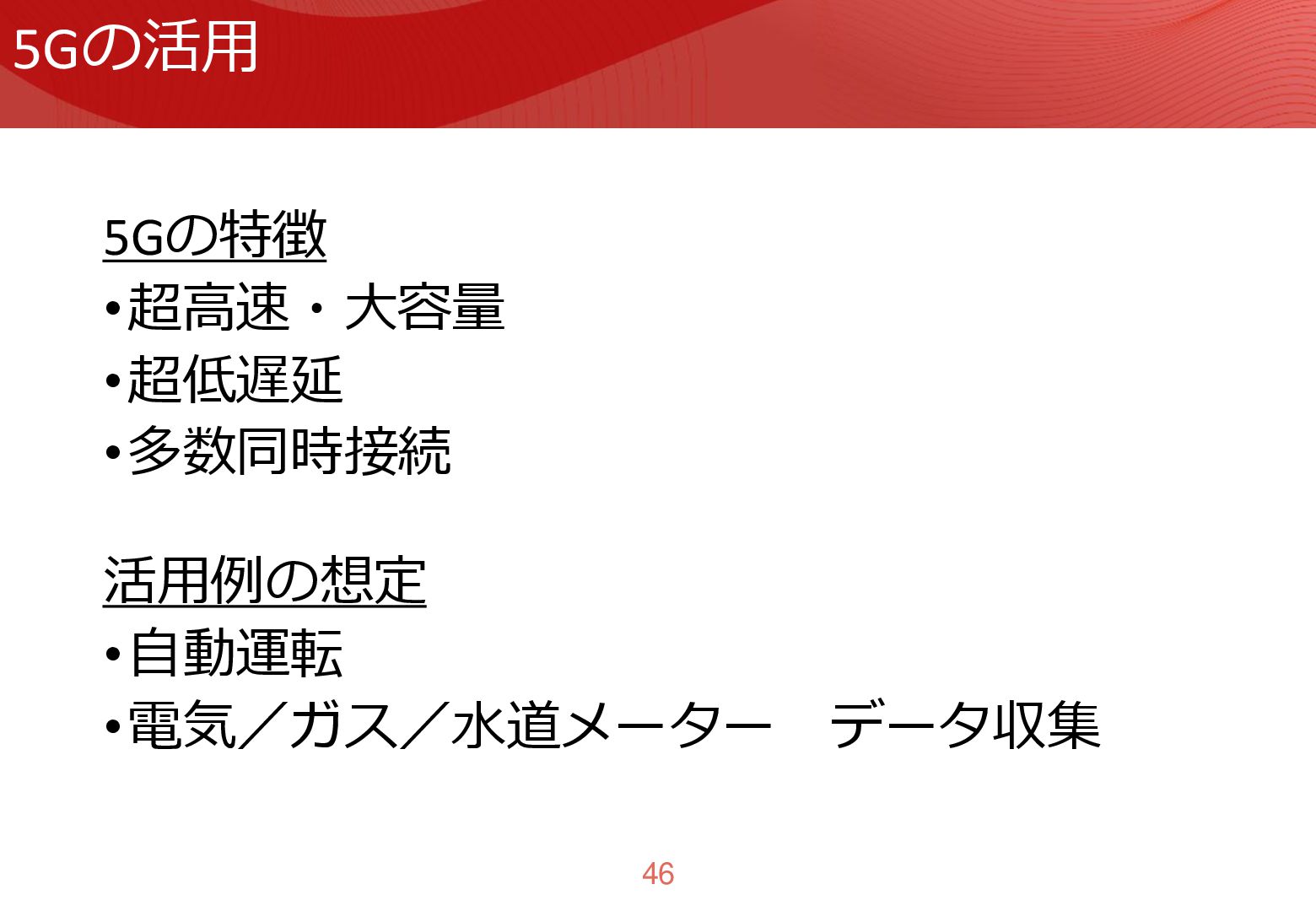 •超高速・大容量 •超低遅延 •多数同時接続 活用例の想定 •自動運転 •電気/ガス/水道メーター データ収集